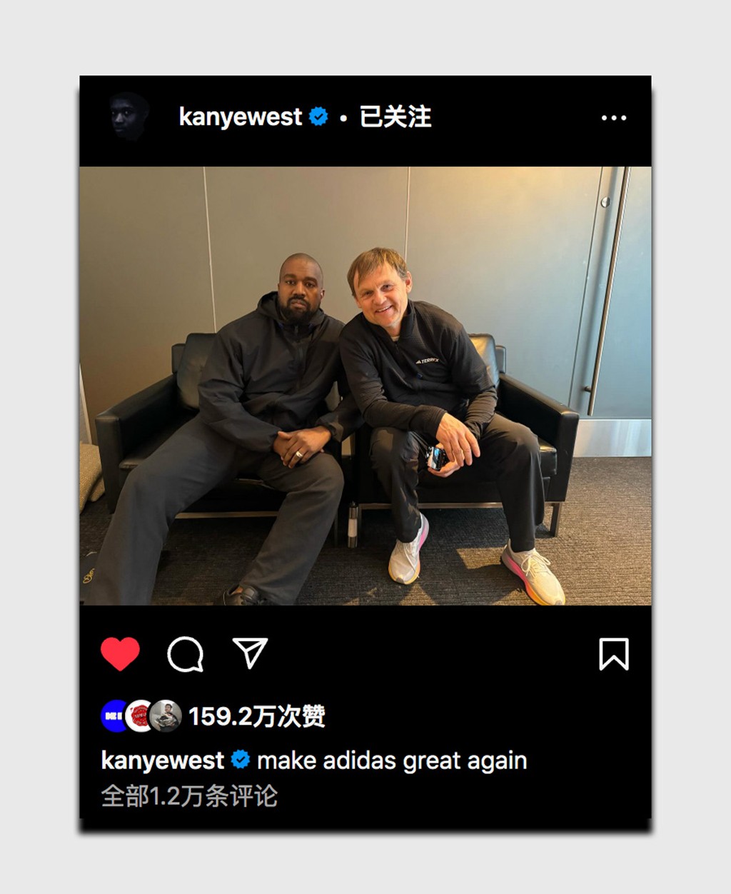 先是今年 2 月的时候,晒出和 adidas CEO 比约恩·古尔登的合影,并配文 “让 adidas 再度伟大”,仿佛双方重归于好了一般。