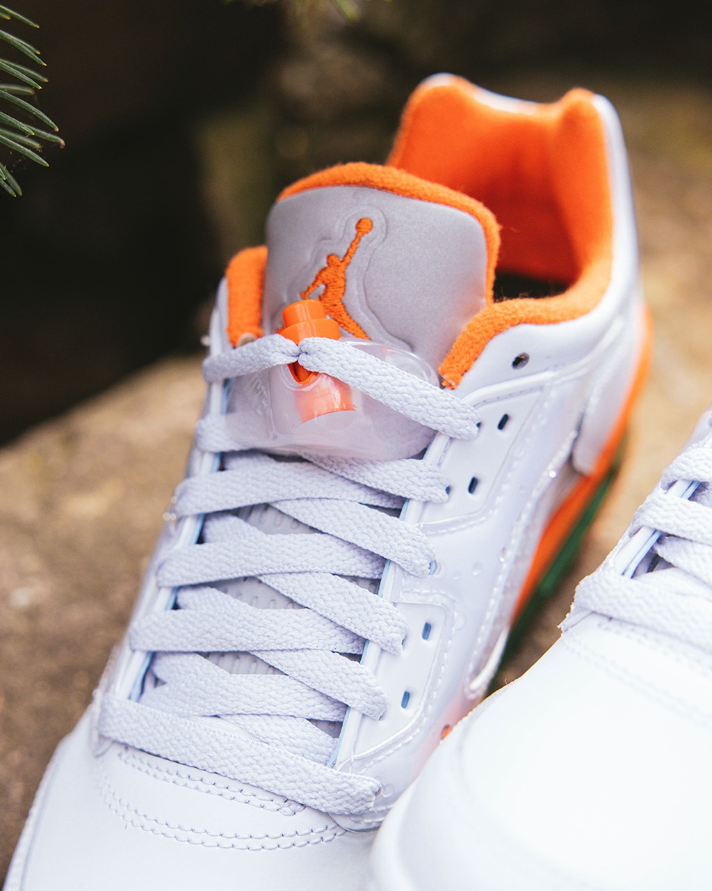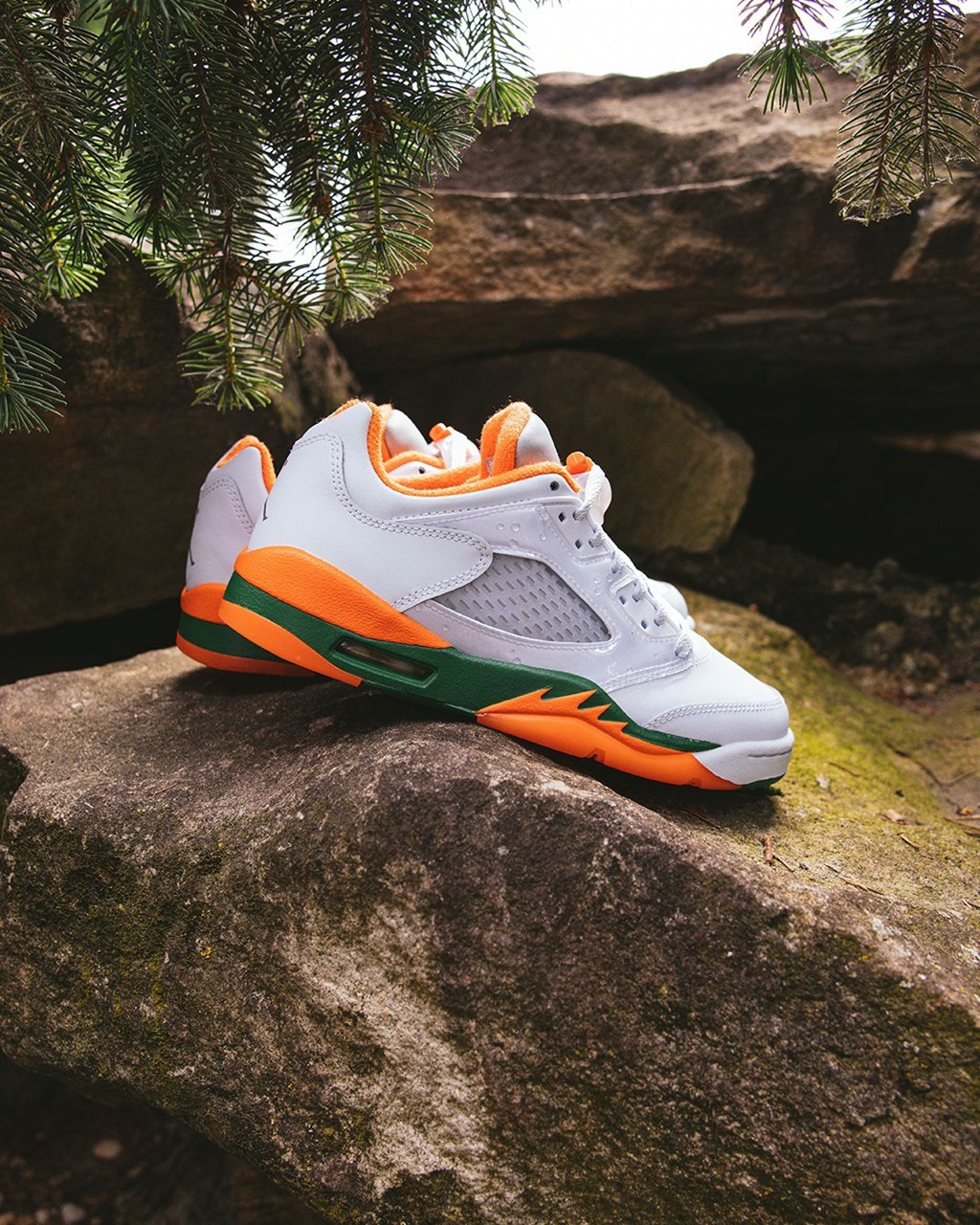 近日,一双全新配色 Air Jordan 5 Low 迎来实物美图。 配色以迈阿密飓风队为灵感,采用绿色搭配橙色营造热带氛围。 鞋面大面积白色则定下主基调,带来清爽的视觉效果。 低帮版也很适合夏季穿着,穿搭难度也不高。 据悉,全新配色 Air Jordan 5 Low 将于 6 月 6 日登场。 Pic via: dtlrofficial