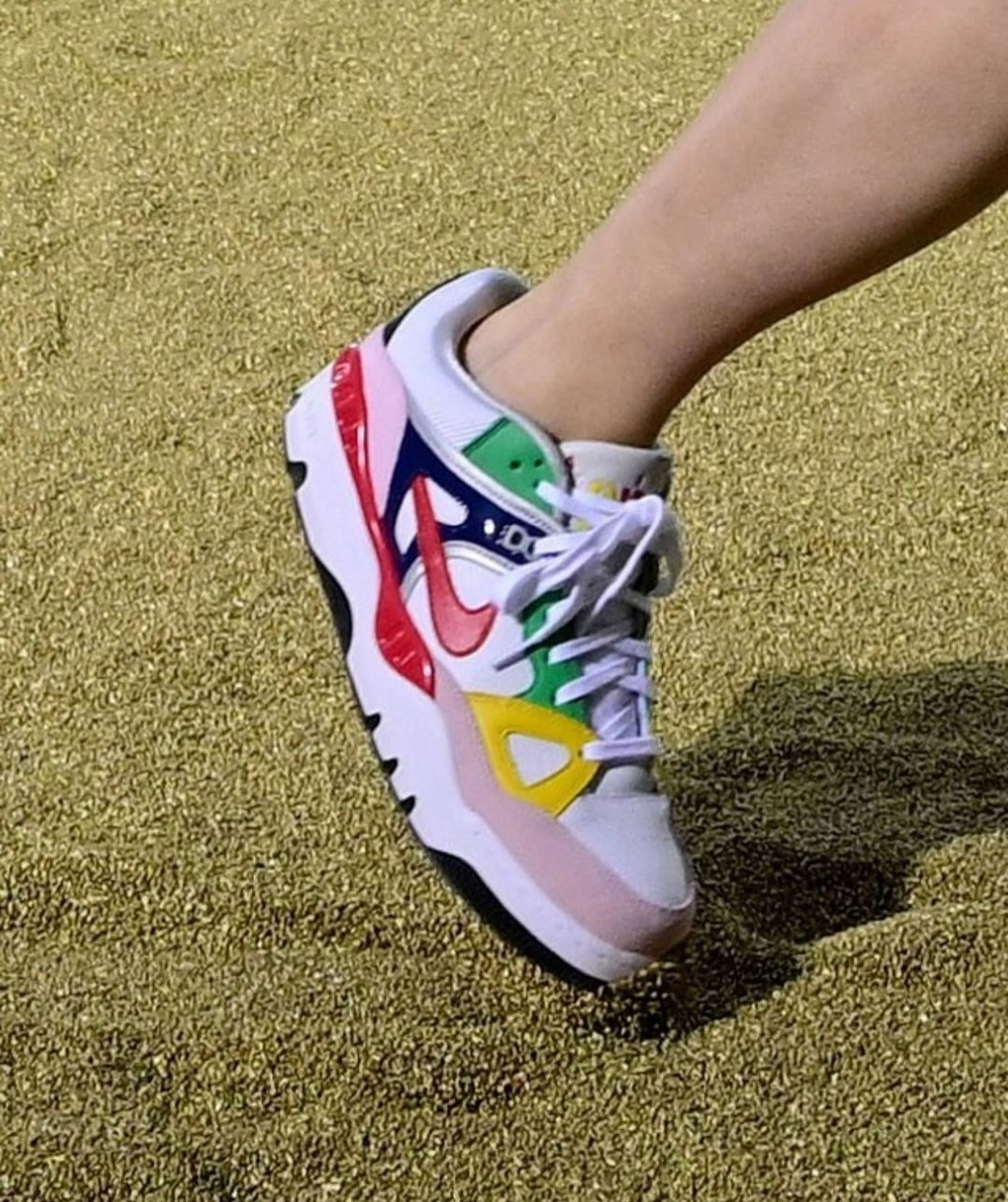 说回昨日上脚的全新鞋款,一改传统素雅色调,将明黄、亮红与白灰相互映衬,后跟则是复古的 Nike Air 标志。