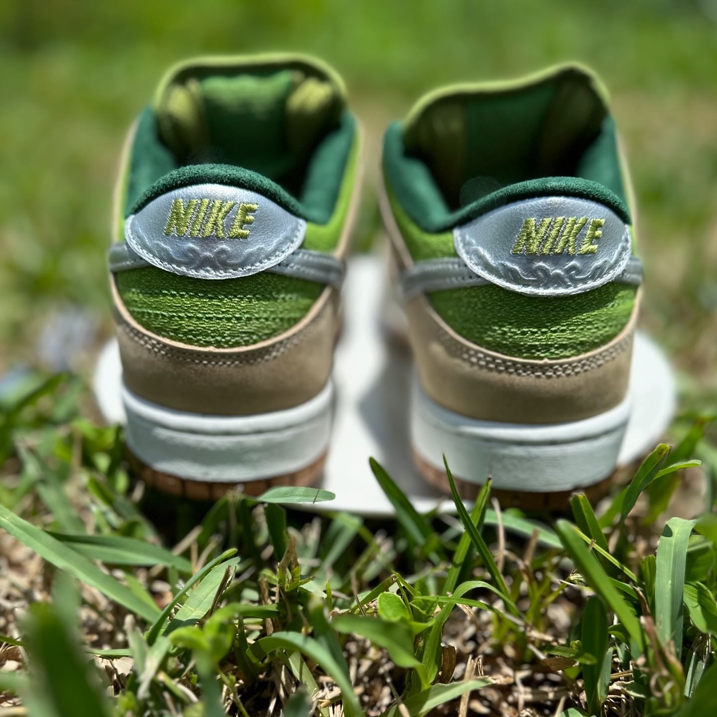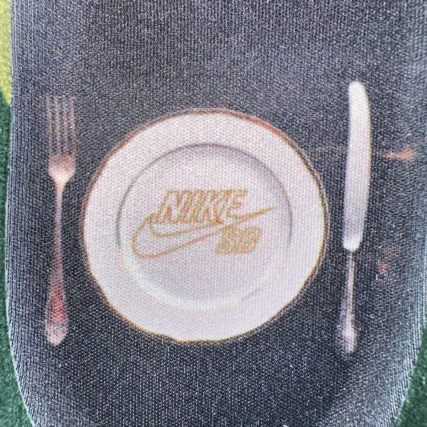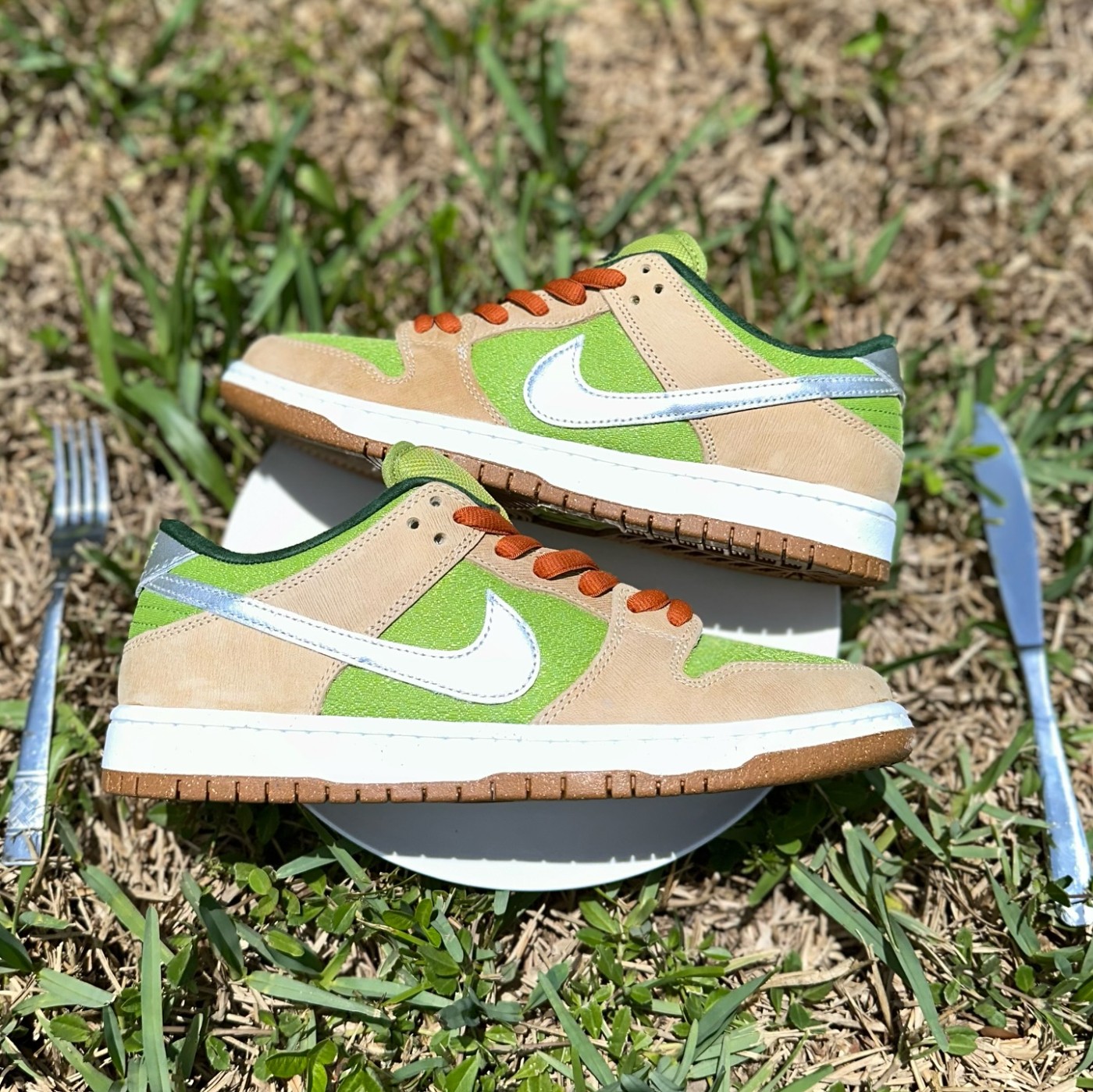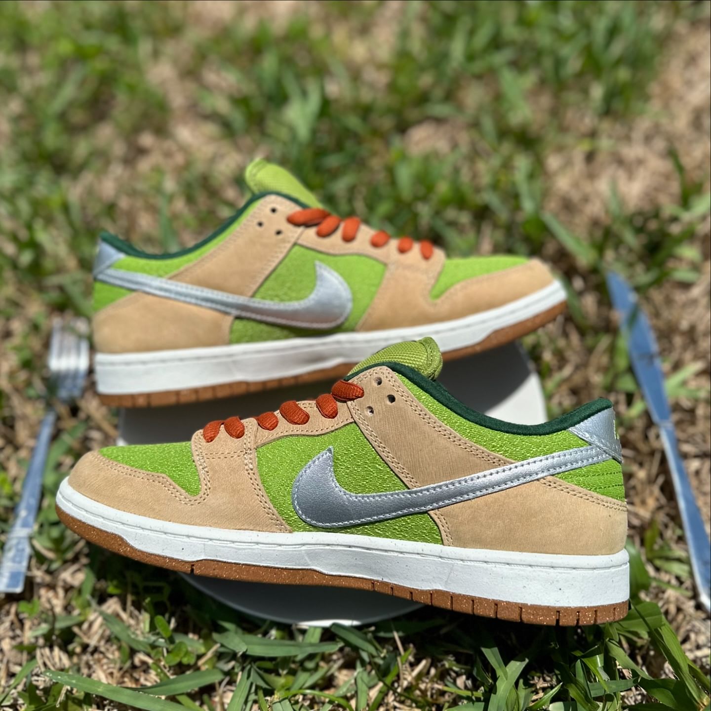 使用浅咖和绿色装扮,有光泽感的鞋侧 Swoosh 象征金属刀叉。