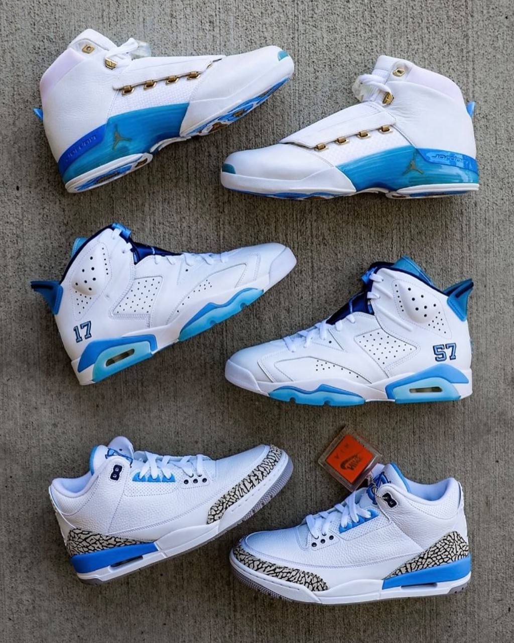 其中细节最多的就是 Air Jordan 6,虽然这张图中没展示完整,但鞋身数字对应的是北卡六座全国冠军的年份。