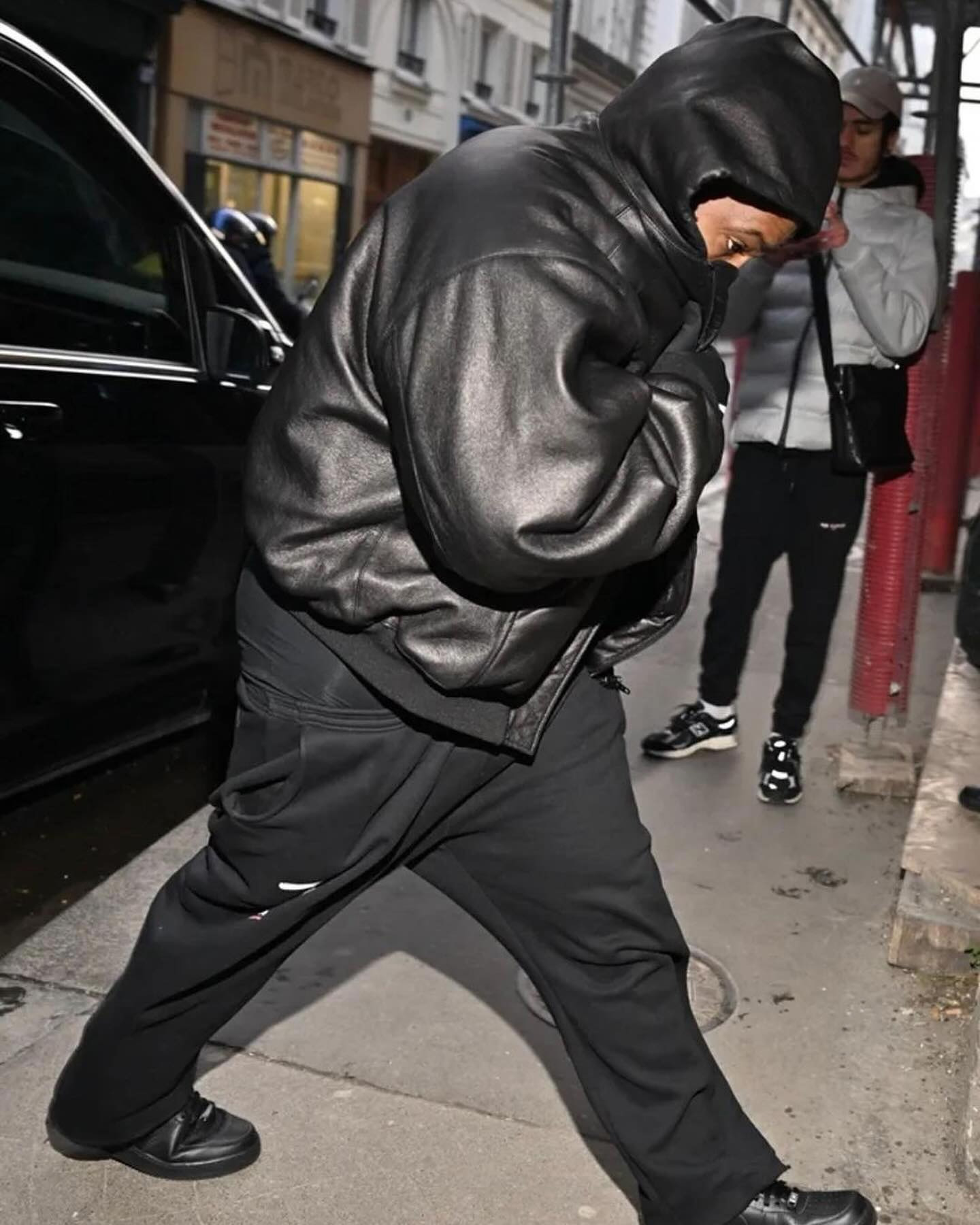 随后现身巴黎的侃爷,脚上穿的依然是这双「纯黑」Nike Air Force 1。