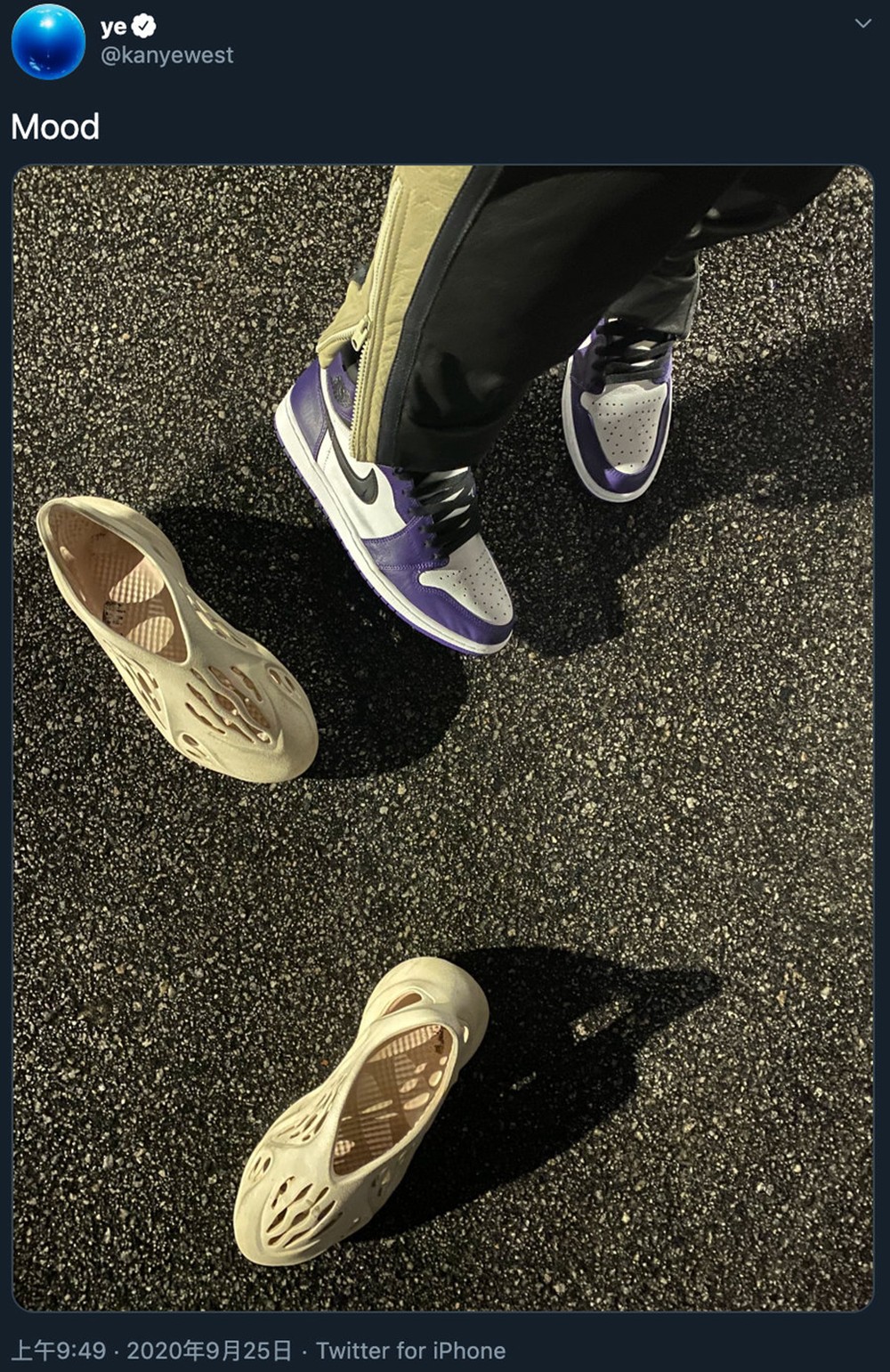 时间再往前,2020 年侃爷甚至还在社交媒体晒出自己穿 Air Jordan 1 的照片。