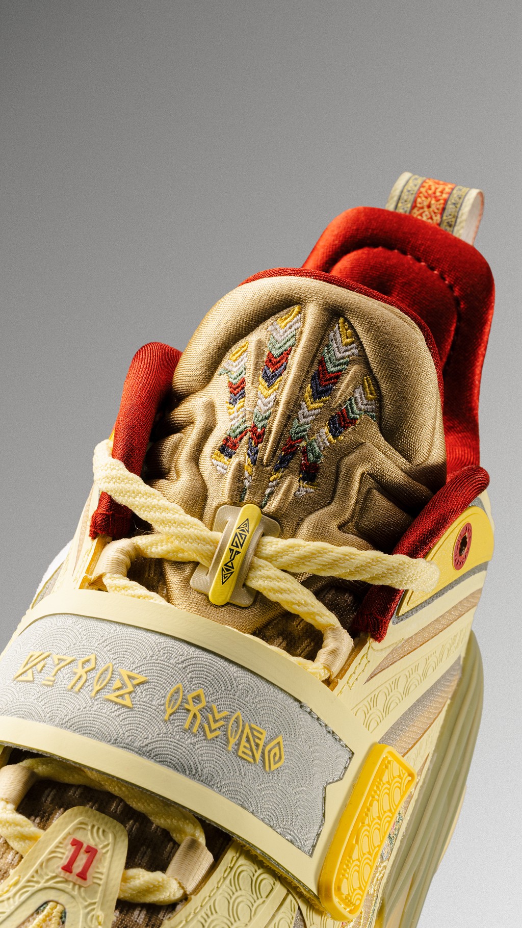 通过复杂而华丽的刺绣图案、祥云暗纹以及贯穿鞋舌的编织纹理,突显设计的用心和工艺之精美。