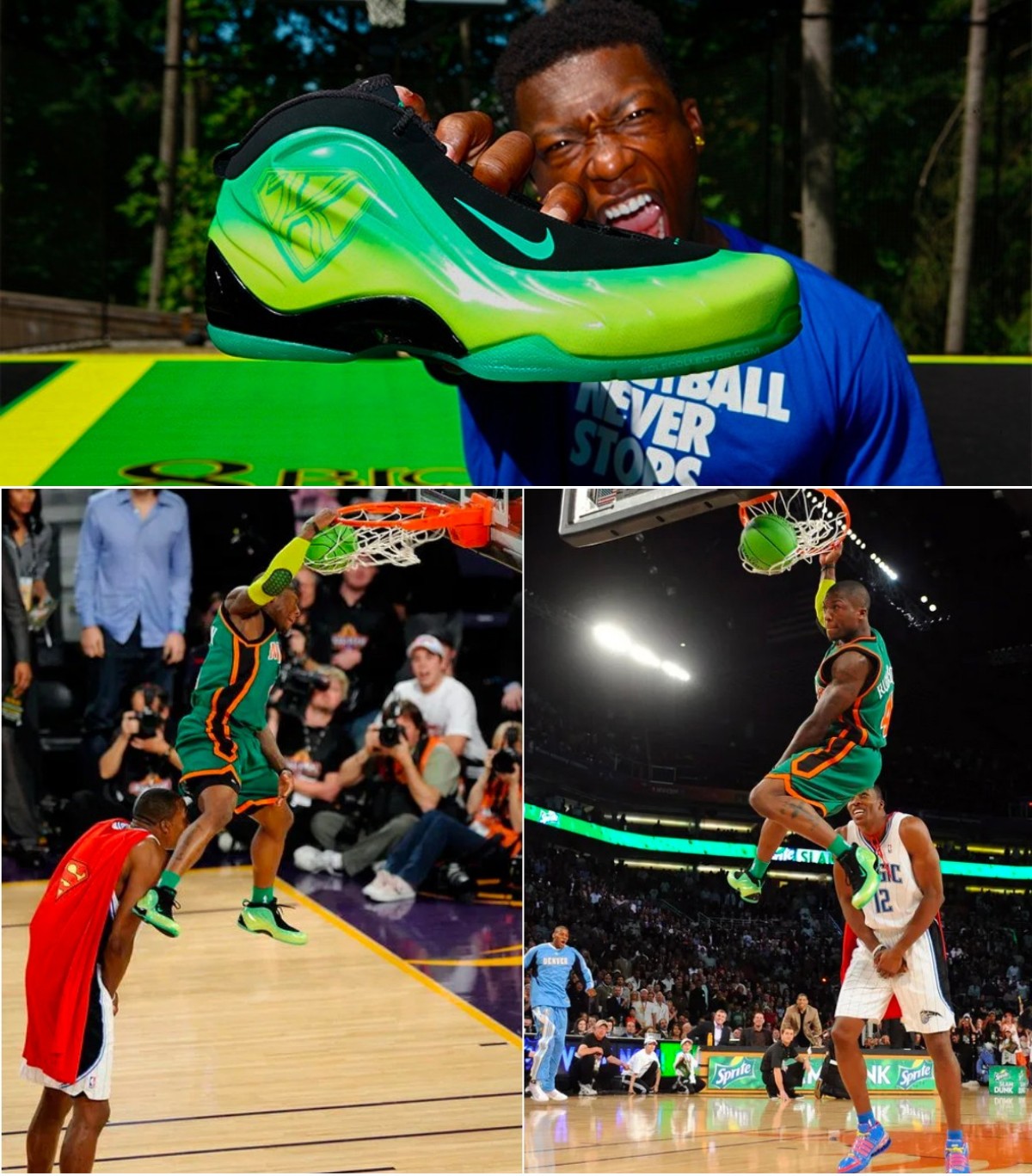 内特·罗宾逊在扣篮大赛演绎超人克星的一战成名,也让 Nike Foamposite Lite 拥有了氪喷的名号。
