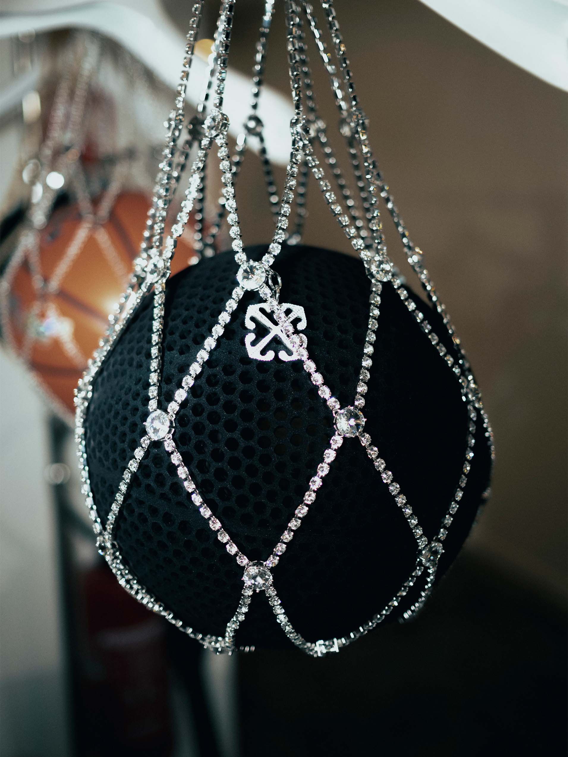 概念款篮球放置在金属篮网中,搭配篮球相关主题场景亮相,暗黑的表面与金属的闪亮形成剧烈的反差,释放前卫、科幻的视觉冲击。