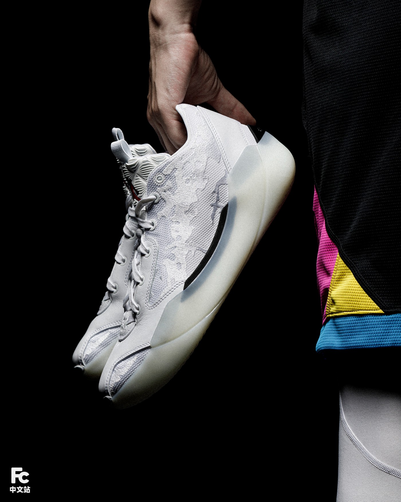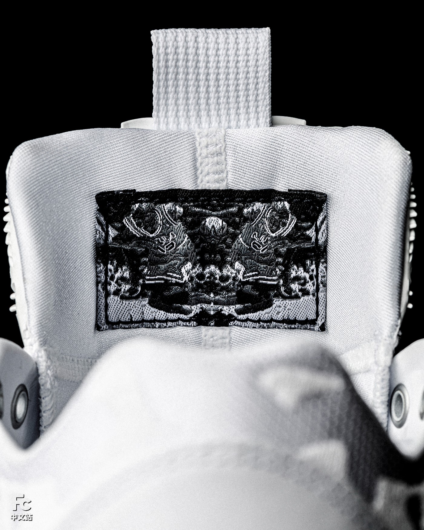 鞋身大面积白色营造的极简基调,通过皮革与刺绣工艺勾勒的织物鞋面相互构建。