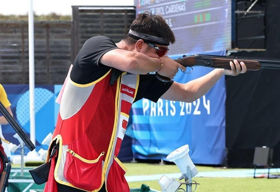 2024 巴黎奥运会男子多向飞碟决赛中,中国选手齐迎获得银牌。