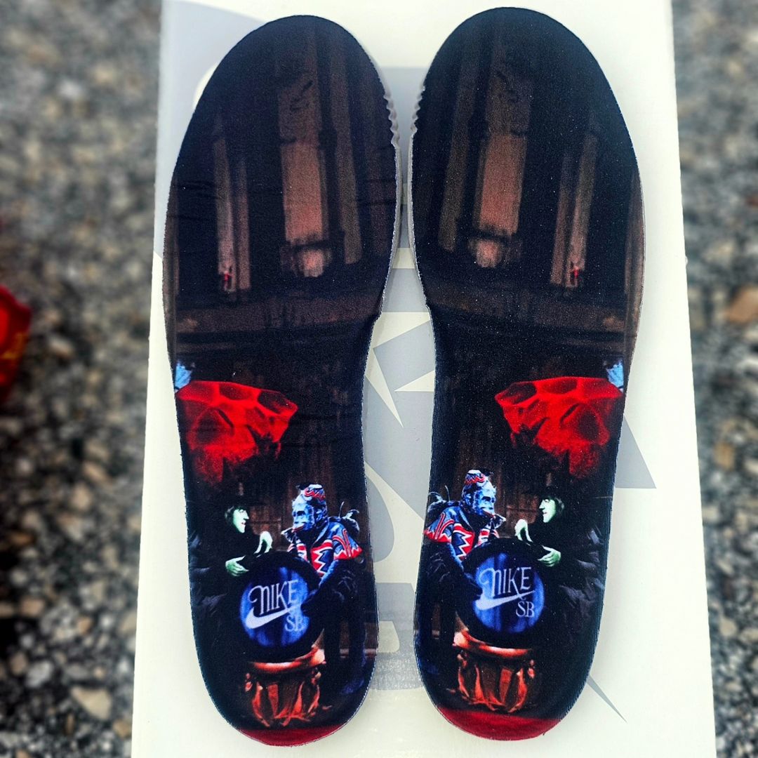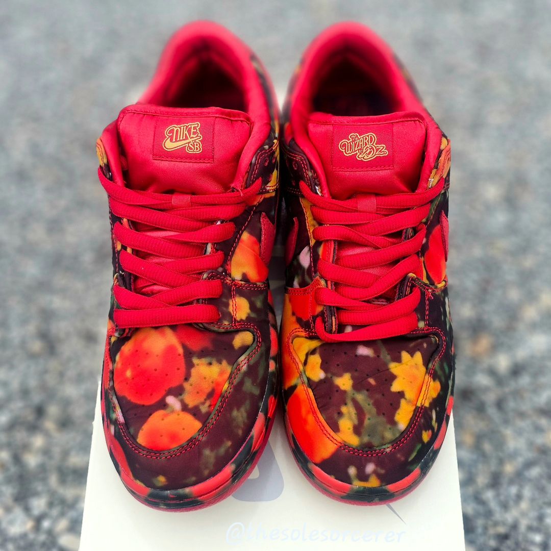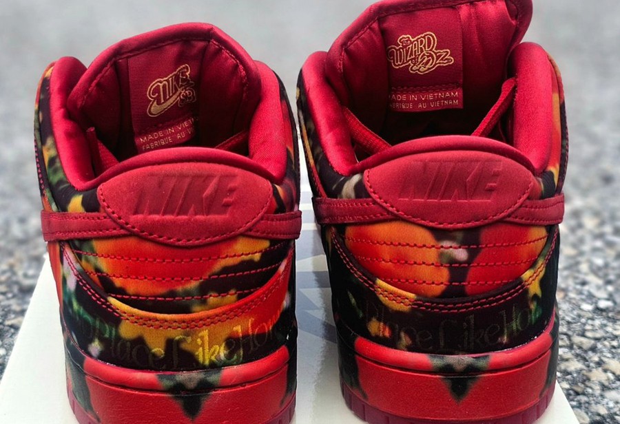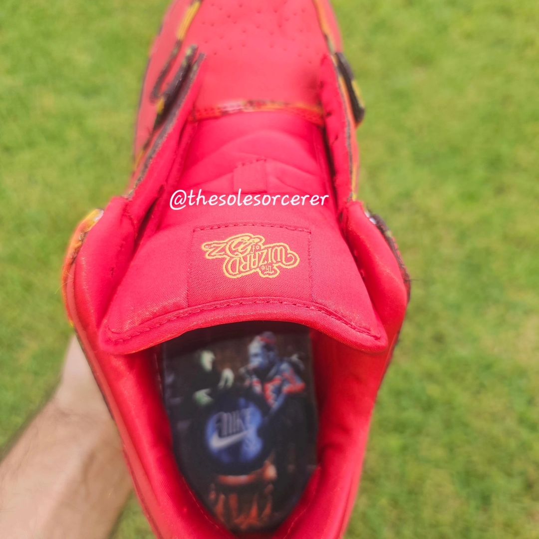 作为联名款式,鞋垫印有《绿野仙踪》主题图案,Nike SB 和 The Wizard of Oz 金色刺绣分布鞋舌内外,设计规格上足够走心。