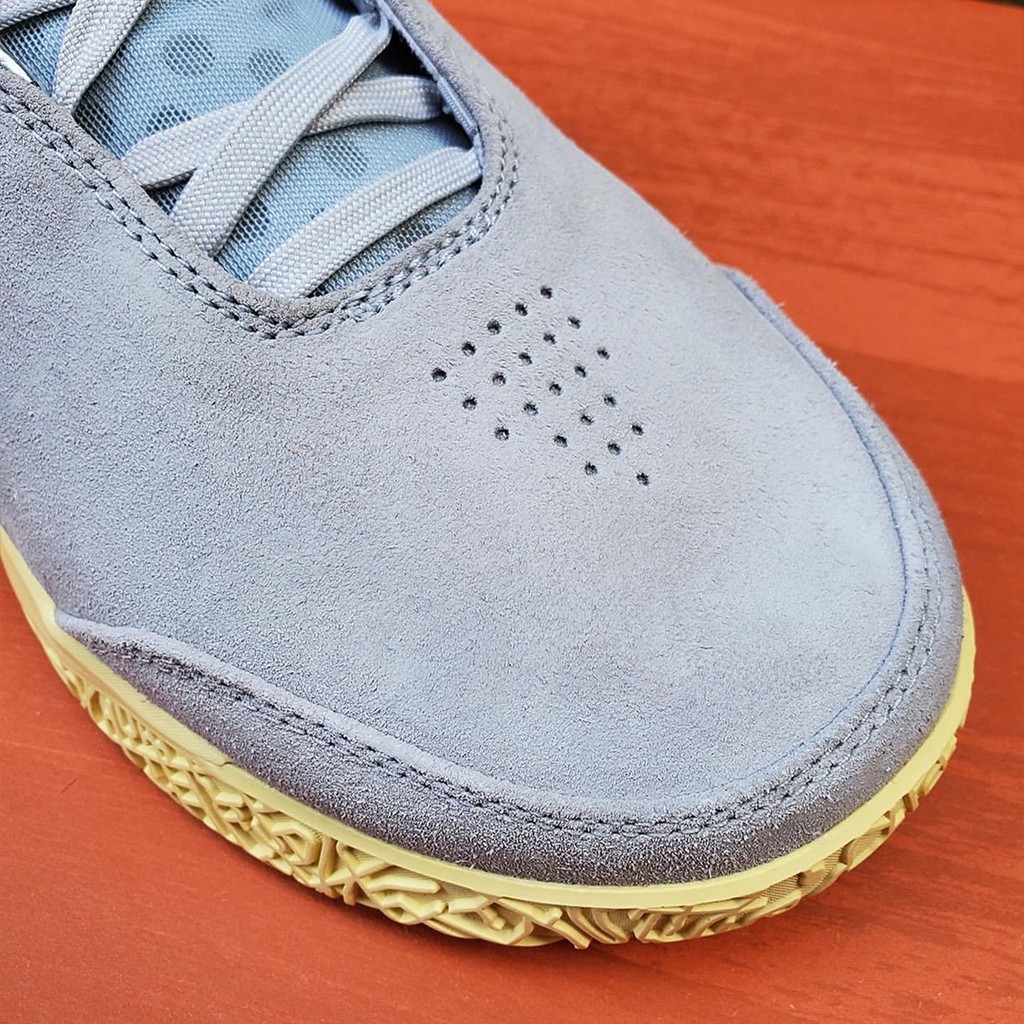 灰色麂皮覆盖大半个鞋面,带来和普通配色不一样的质感,细节则点缀砖红色,带来更多色彩层次。
