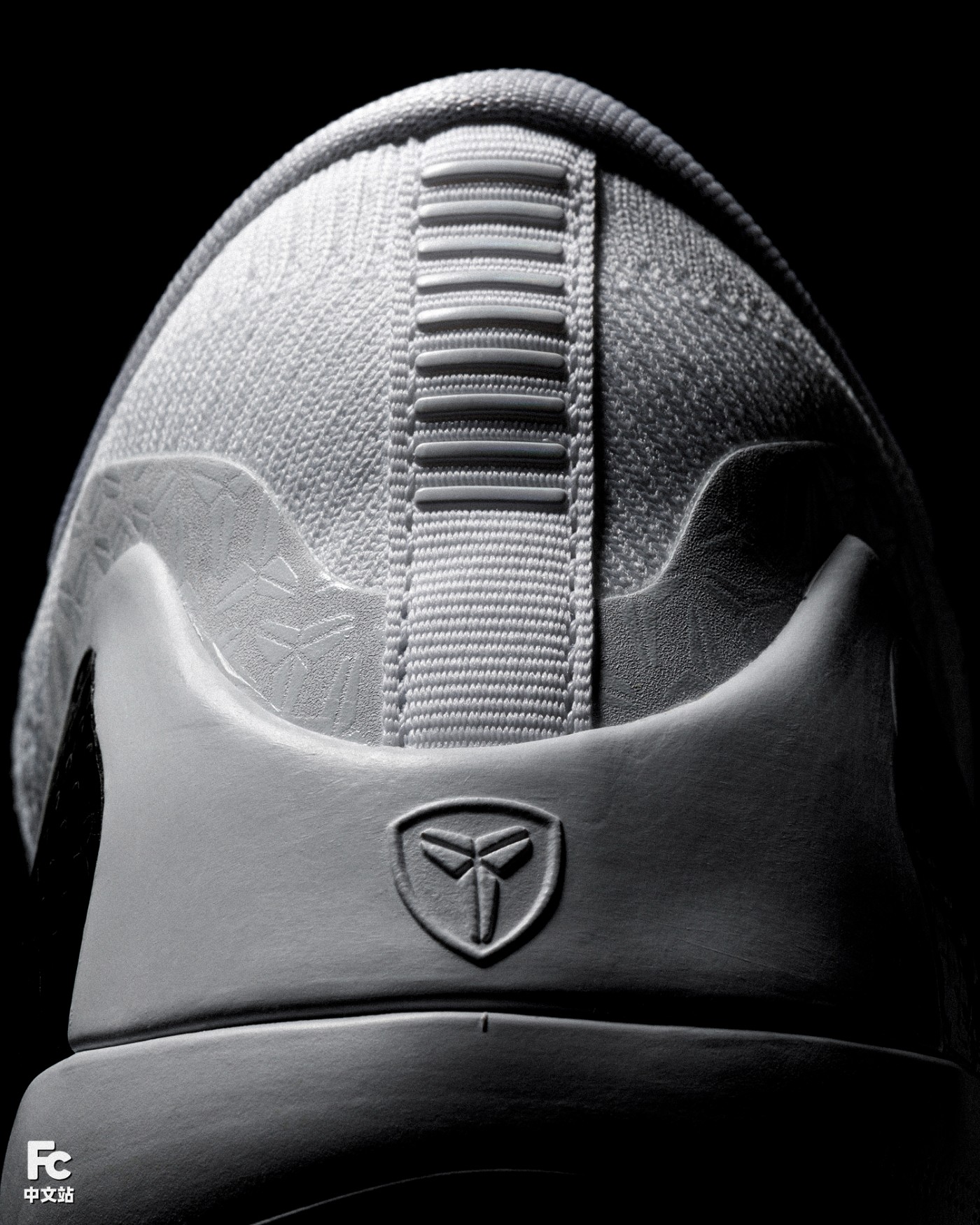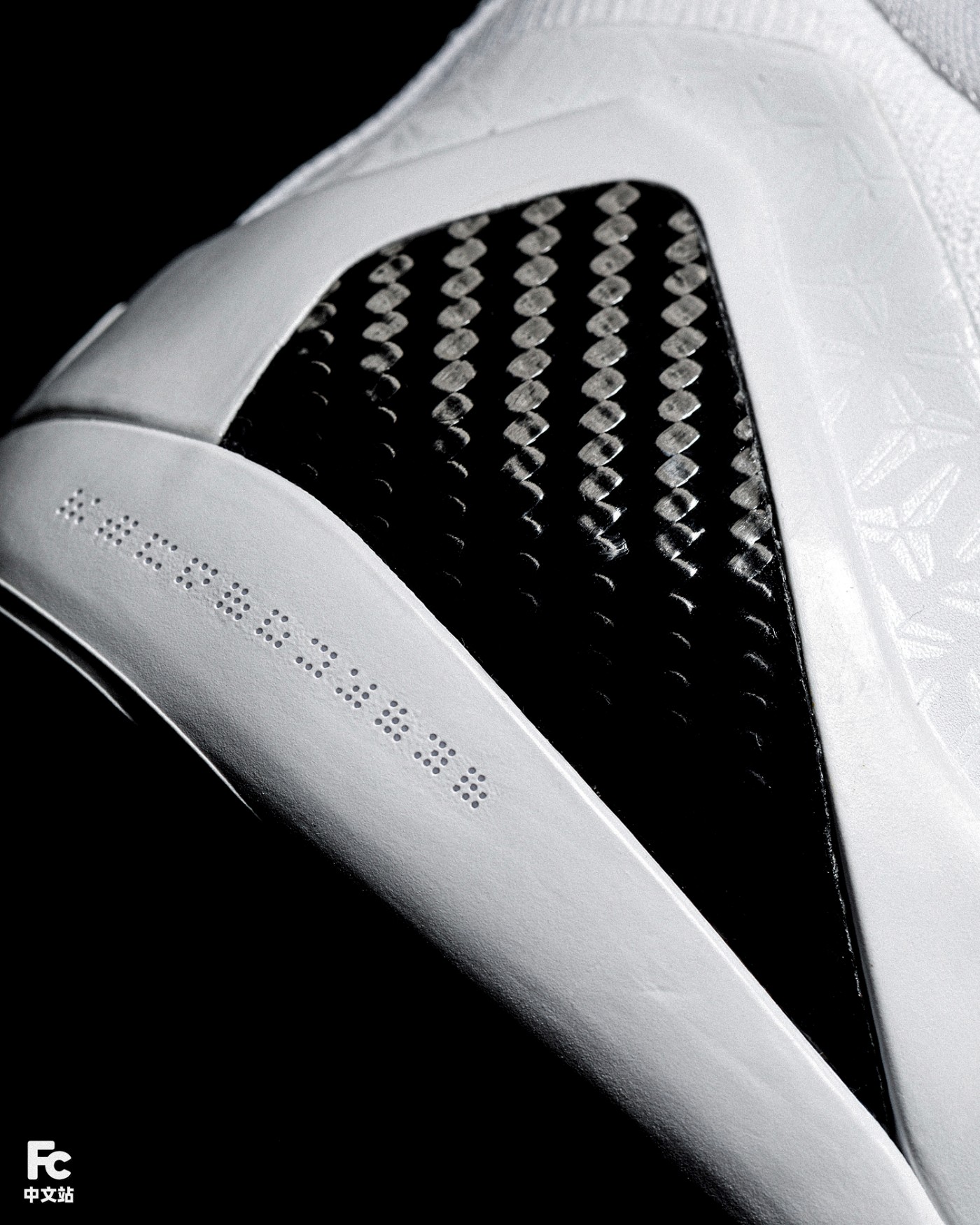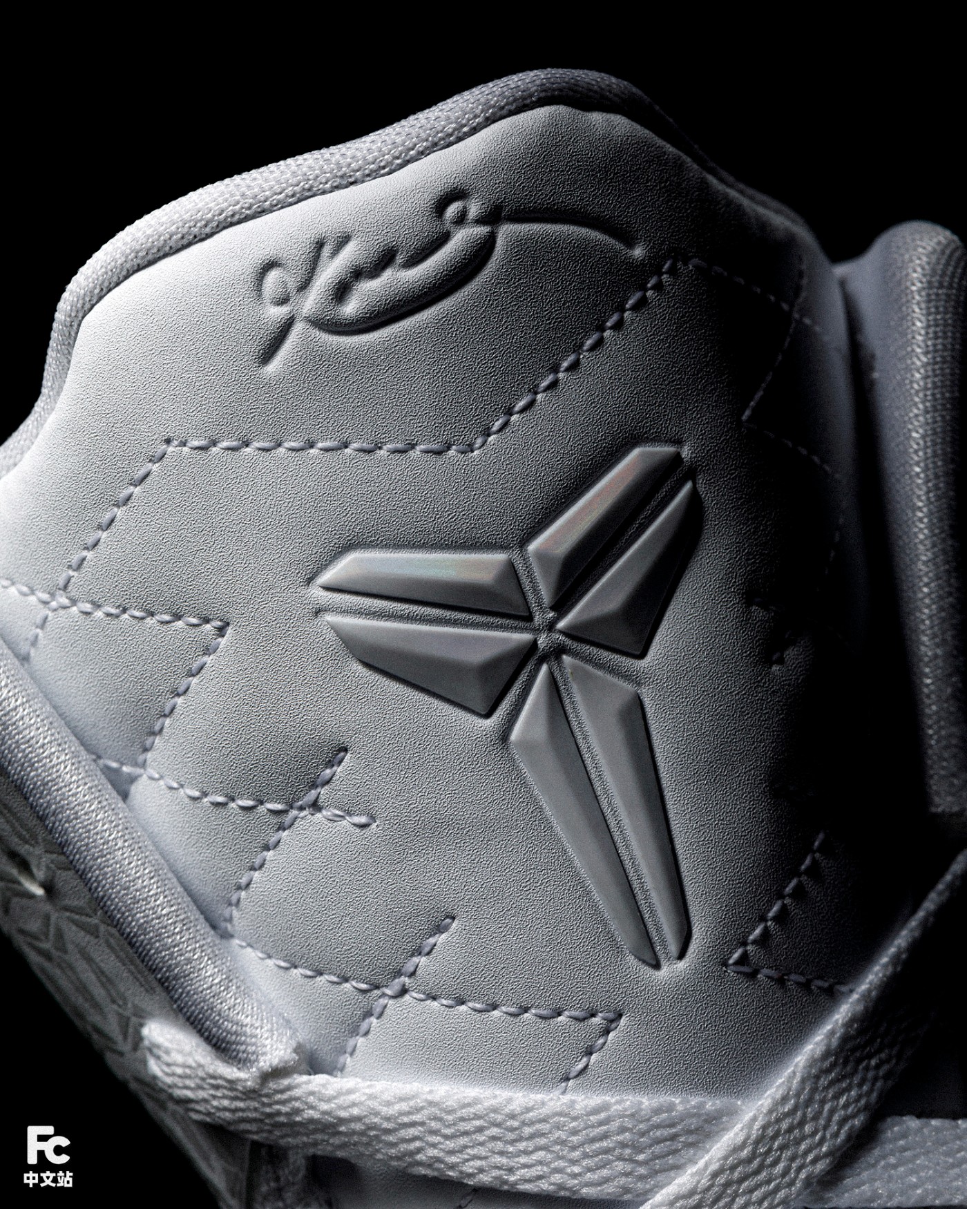 鞋面白色皮革的热熔部分,暗藏满印的科比武士 Logo 花纹。