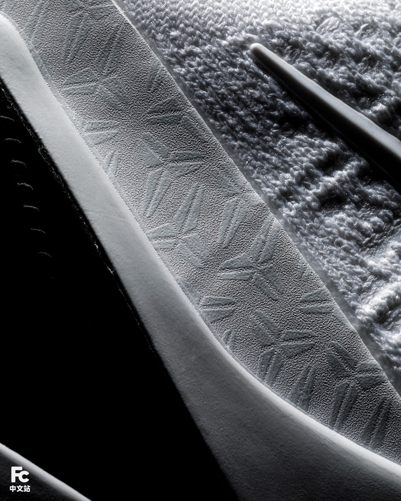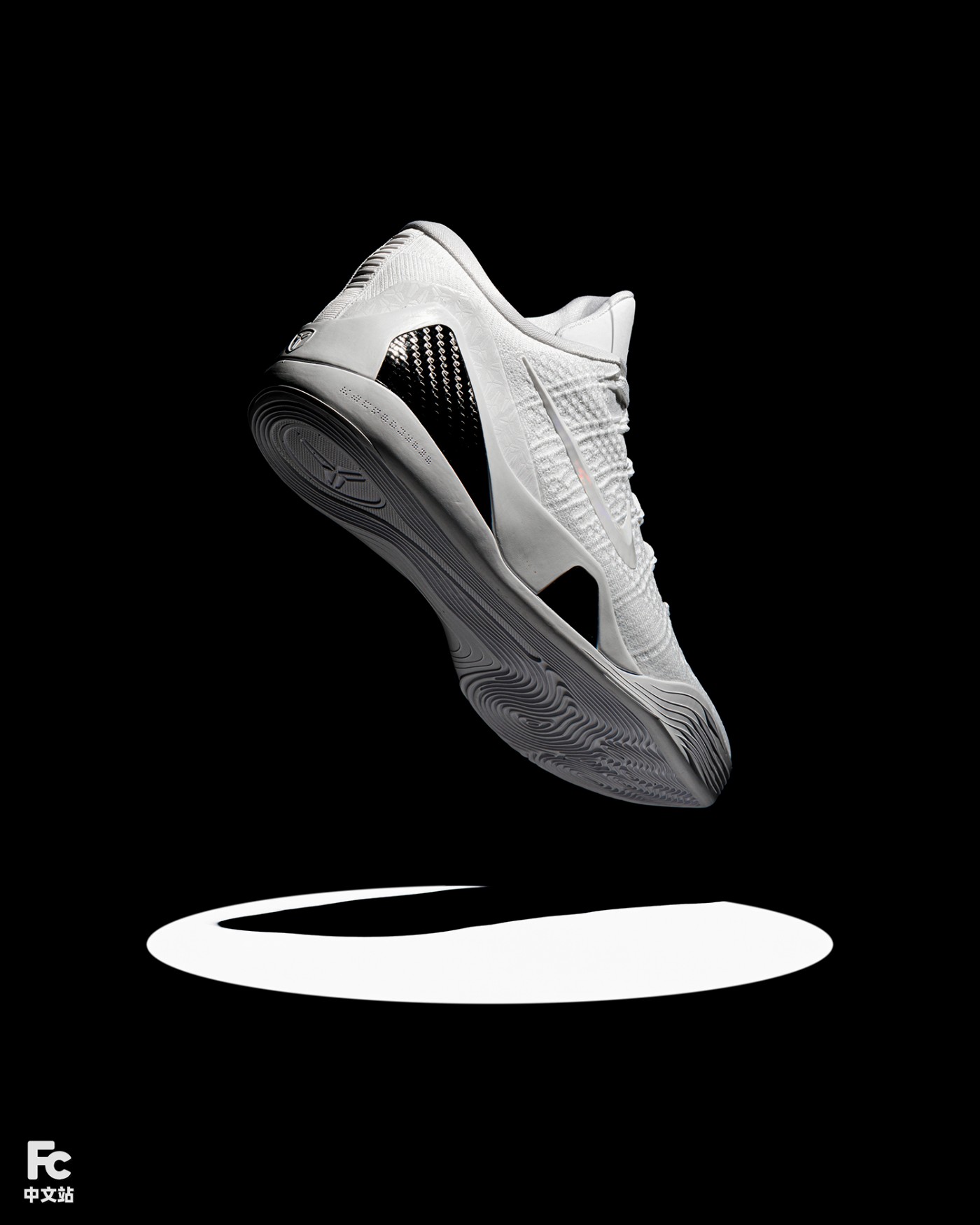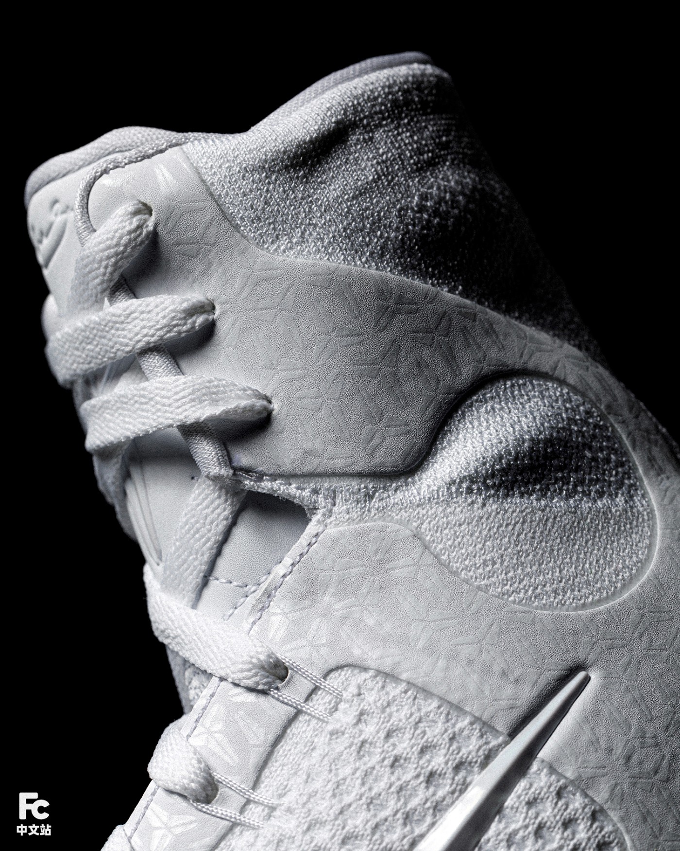 鞋面白色皮革的热熔部分,暗藏满印的科比武士 Logo 花纹。