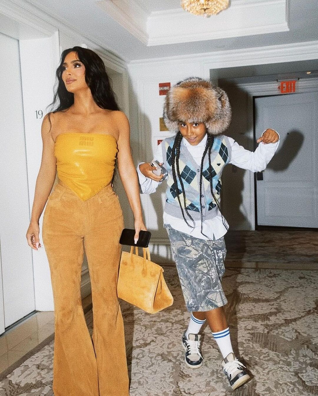 小西北则是头戴一顶皮草帽,有不少人说这是受到了侃爷现任比安卡(Bianca)的影响。