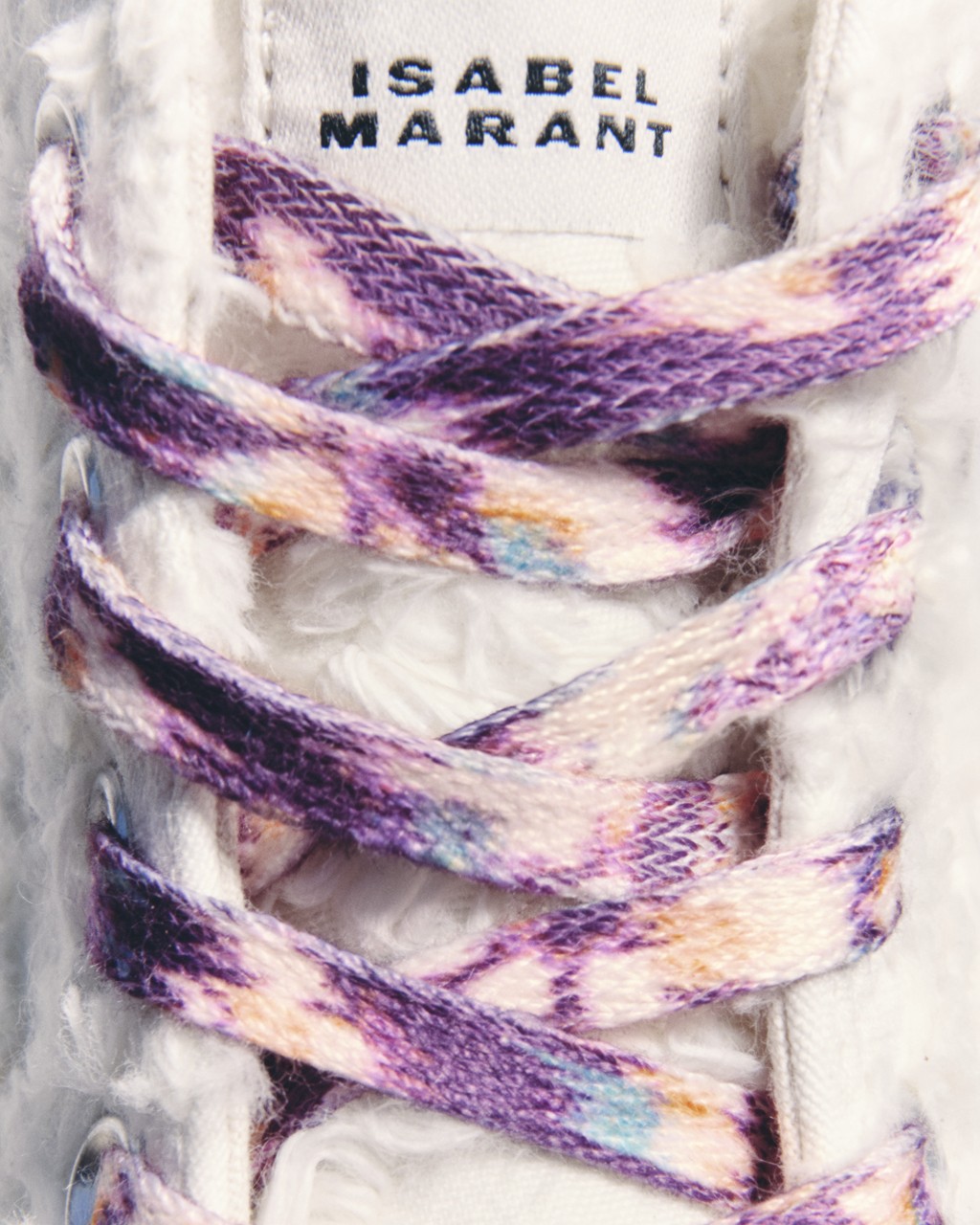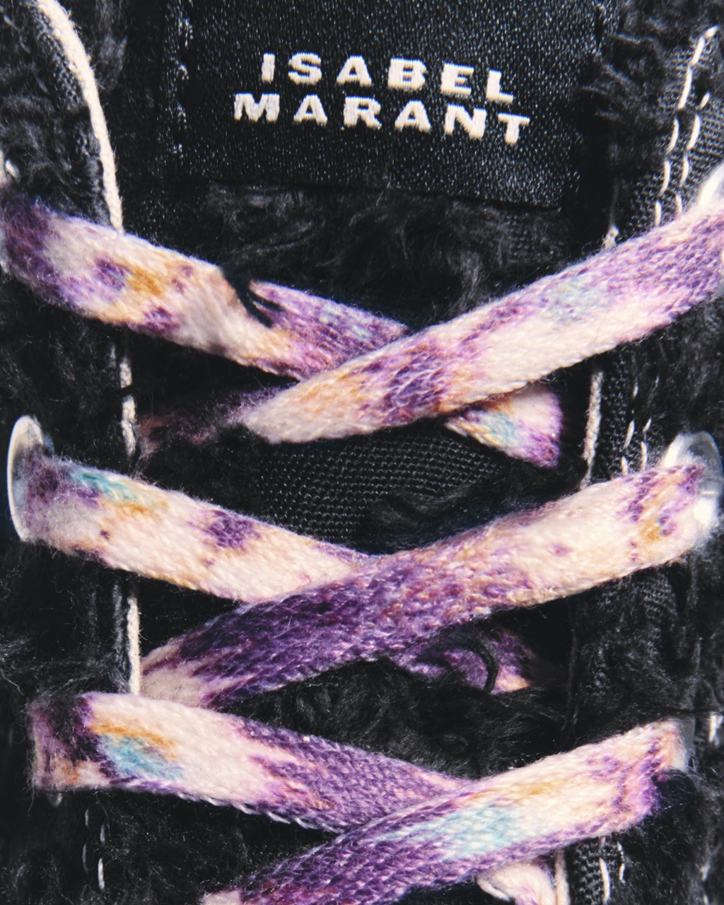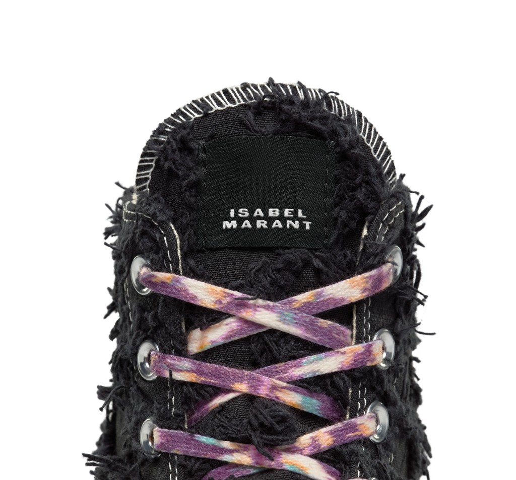 包括棉质与涤纶织物毛边鞋面、鞋侧 Isabel Marant 毛边帆布 Logo、彩色条纹印花鞋边包条以及与主导色相呼应的彩色印花半透明外底。