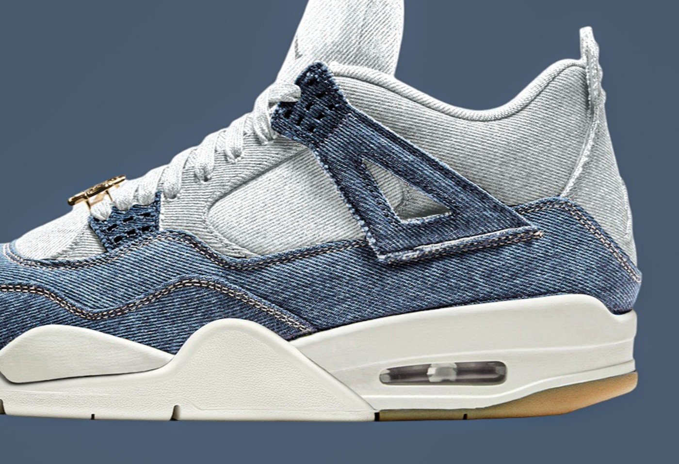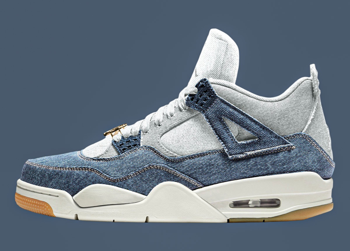 这双 Air Jordan 4 Denim “Worn Blue” 采用了牛仔单宁布料打造鞋身,与此前的 Levis 联名同出一辙。