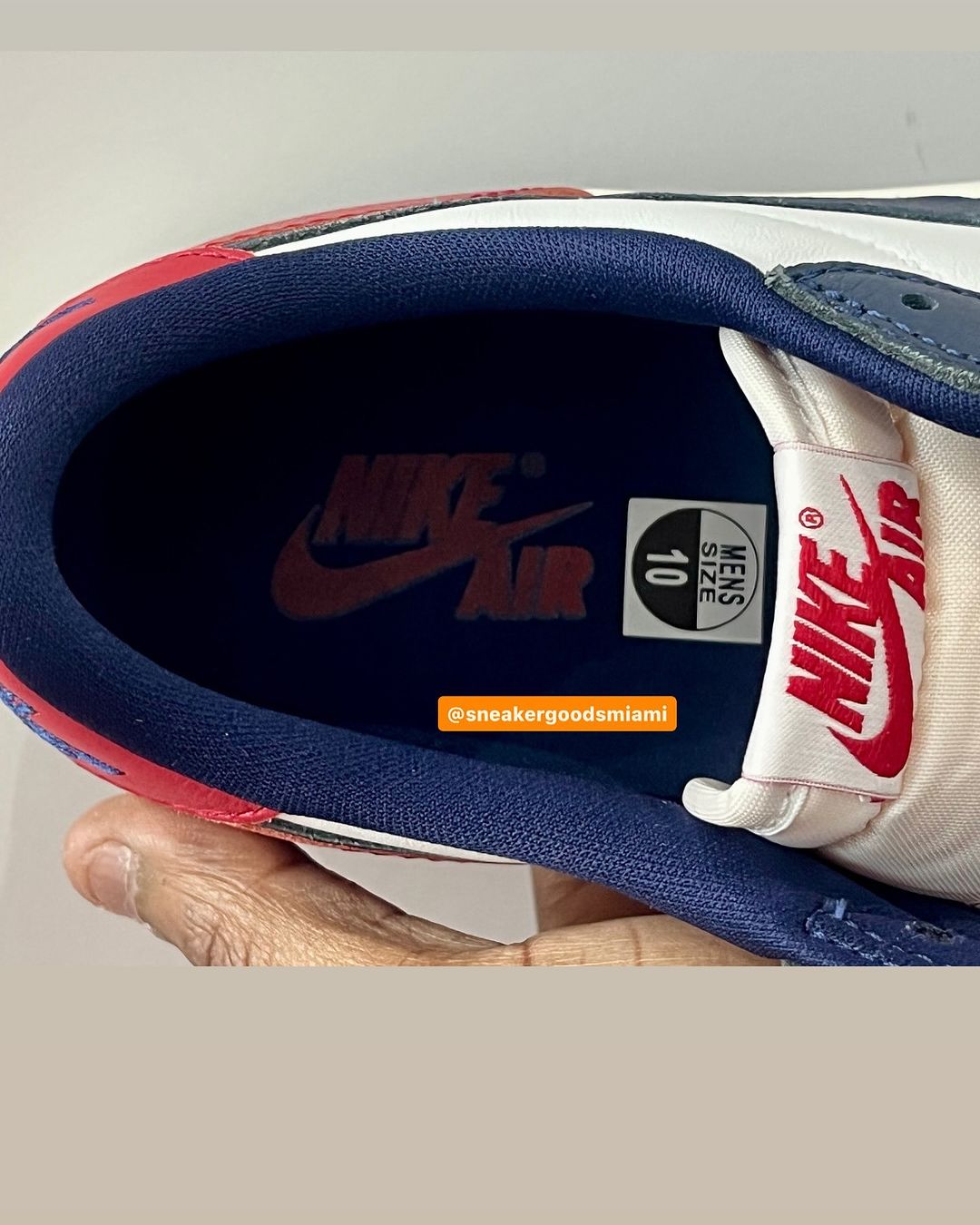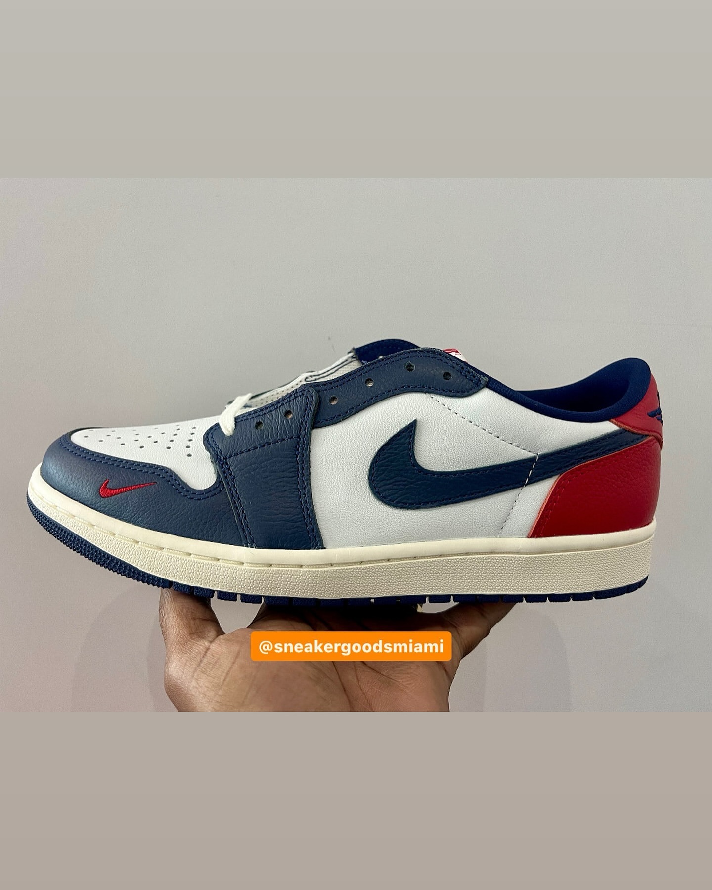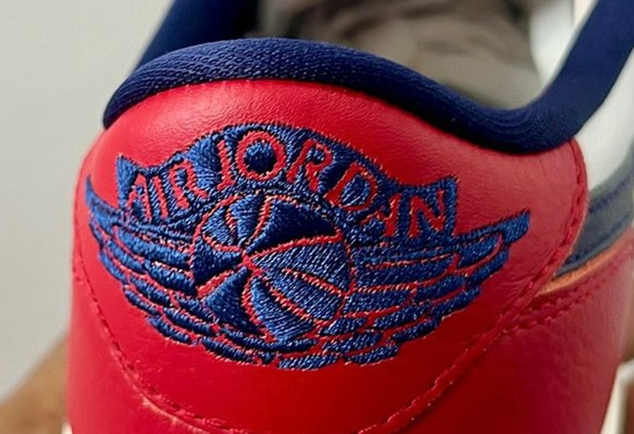 而眼前这款配色则是熟悉的光面皮革。好在还是红白蓝的配色方案,只是鞋头位置由红色改为蓝色。