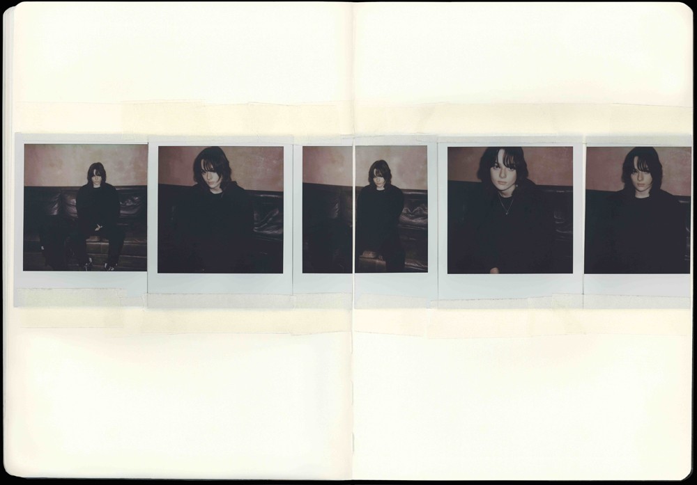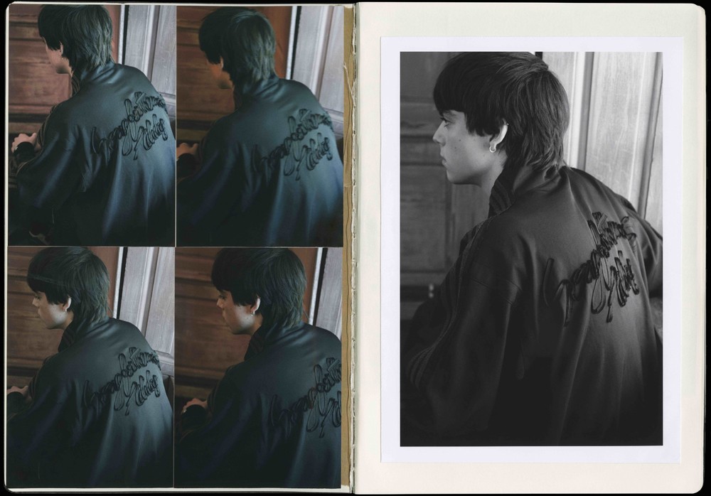 与之搭配的是两件经过水洗和做旧处理的长袖 T 恤,颜色分别为深红色和黑色,呈现出一种历久弥新的质感。
