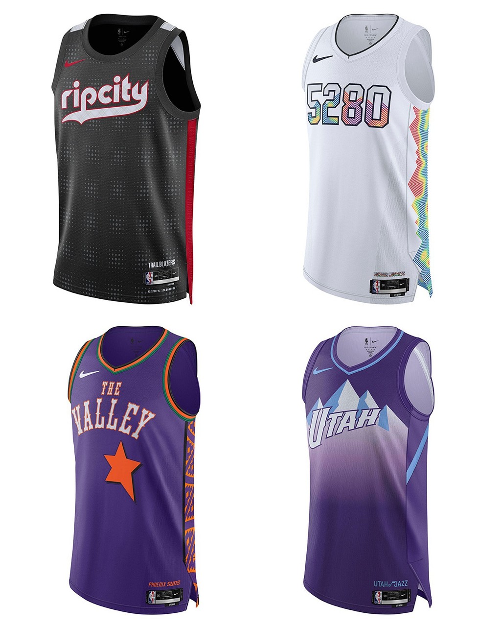 爵士队选择保留了经典的复古紫色雪山,开拓者的款式也变化不大,太阳队球衣看起来是在致敬当年的全明星赛球衣,而掘金则继续融入经典彩虹元素。