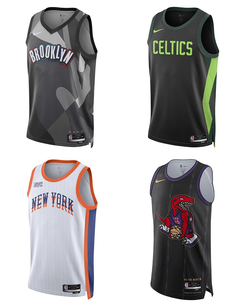 纽约双雄也都基本保留了上赛季的元素,一边是 KAWS 涂鸦,一边是 KITH 联名,猛龙简单粗暴地直接印上复古队徽,至于凯尔特人嘛……人家好歹是冠军,这城市版球衣也未免太……