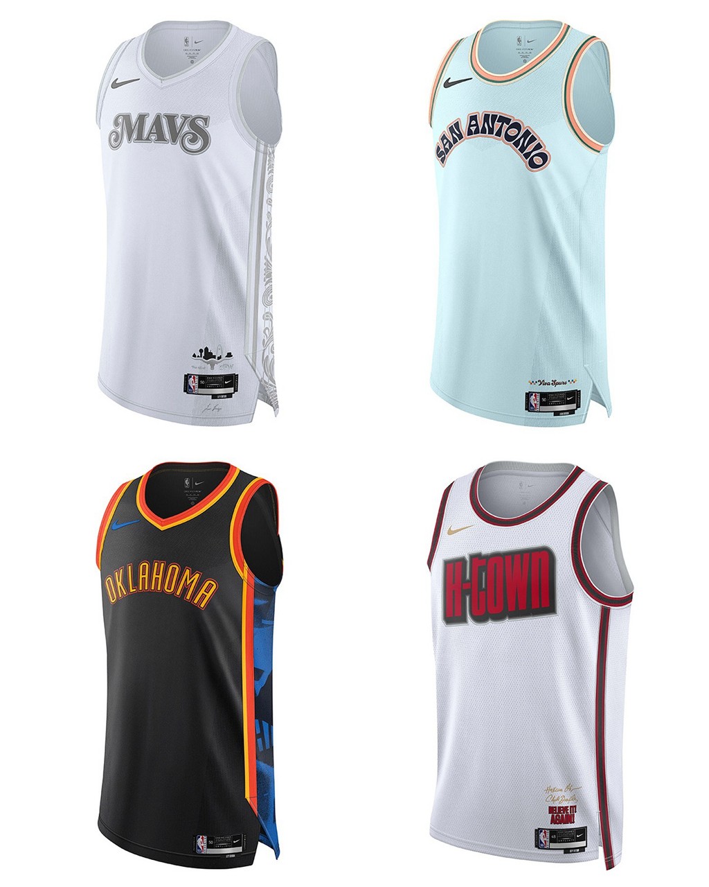 独行侠这边,黑白灰的配色甚是干净清爽,侧面也有不少细节,马刺和上赛季变化不大,火箭也保留了 H-TOWN 的城市绰号,雷霆这件倒是深得小编的心,保留了队伍经典配色的同时,也有更多新元素。