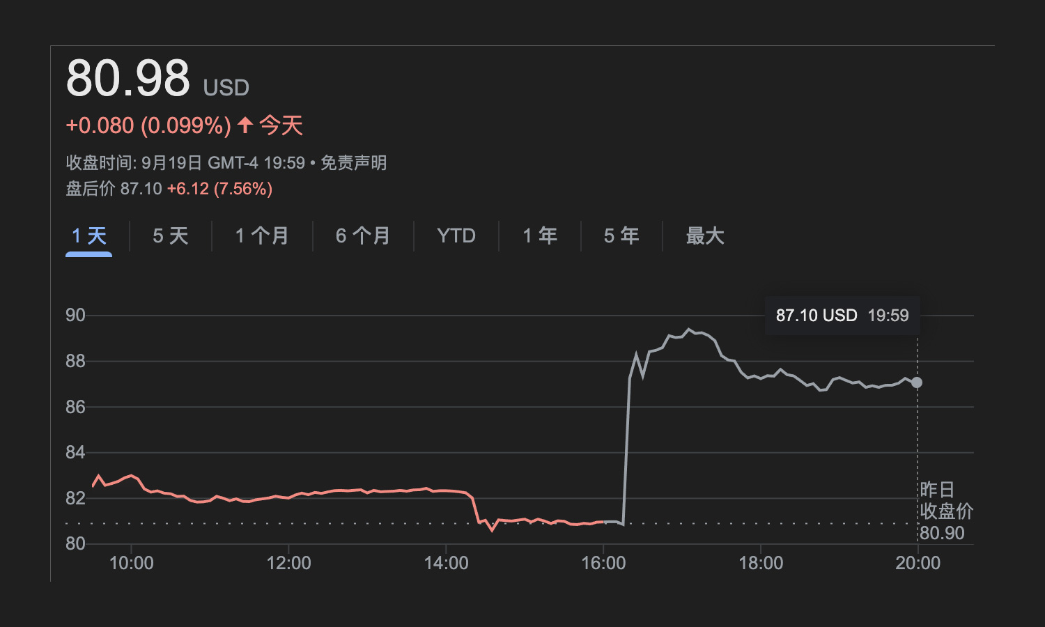 在这一公告宣布之后,Nike 的盘后股价暴涨 10%,目前已经有所回落,但依然有近 8% 的涨幅。