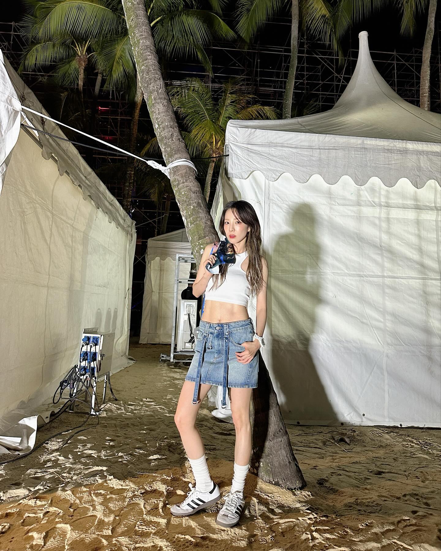 除了 Samba 以外,同样有不错人气的 Gazelle 也时常上脚搭配,朴山多拉潮流品味不用多说。