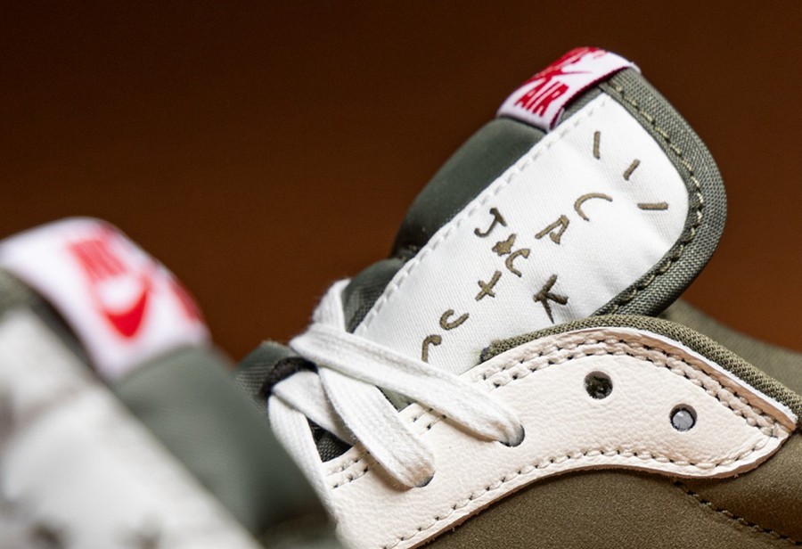 这双鞋的细节设计大家再熟悉不过了,鞋舌有 Cactus Jack 字样,后跟则分别是笑脸和飞翼刺绣。