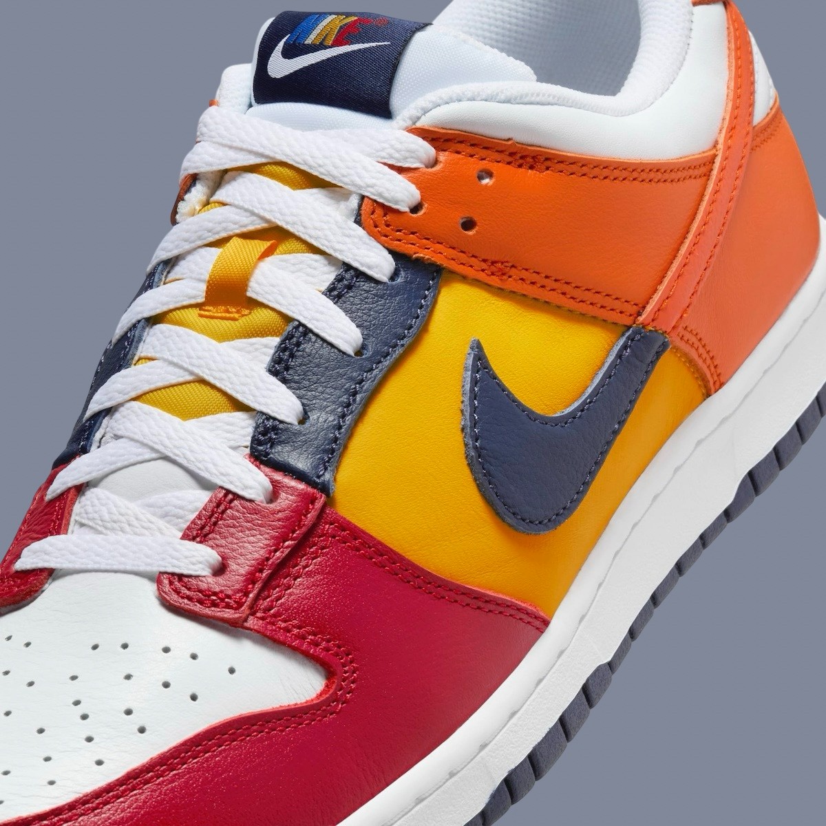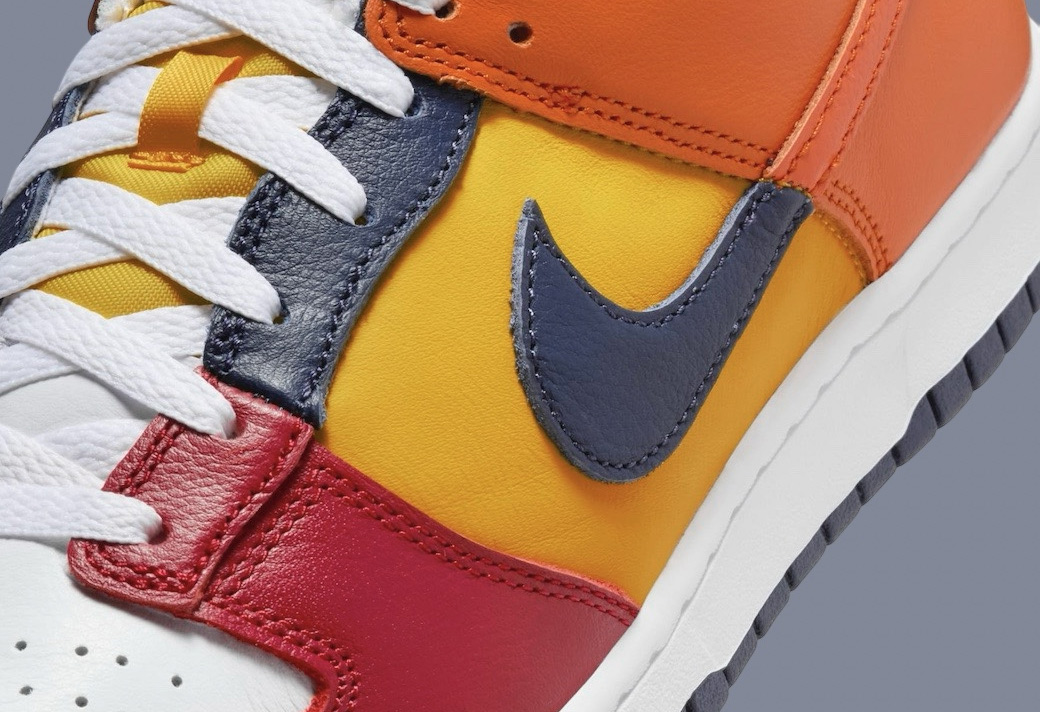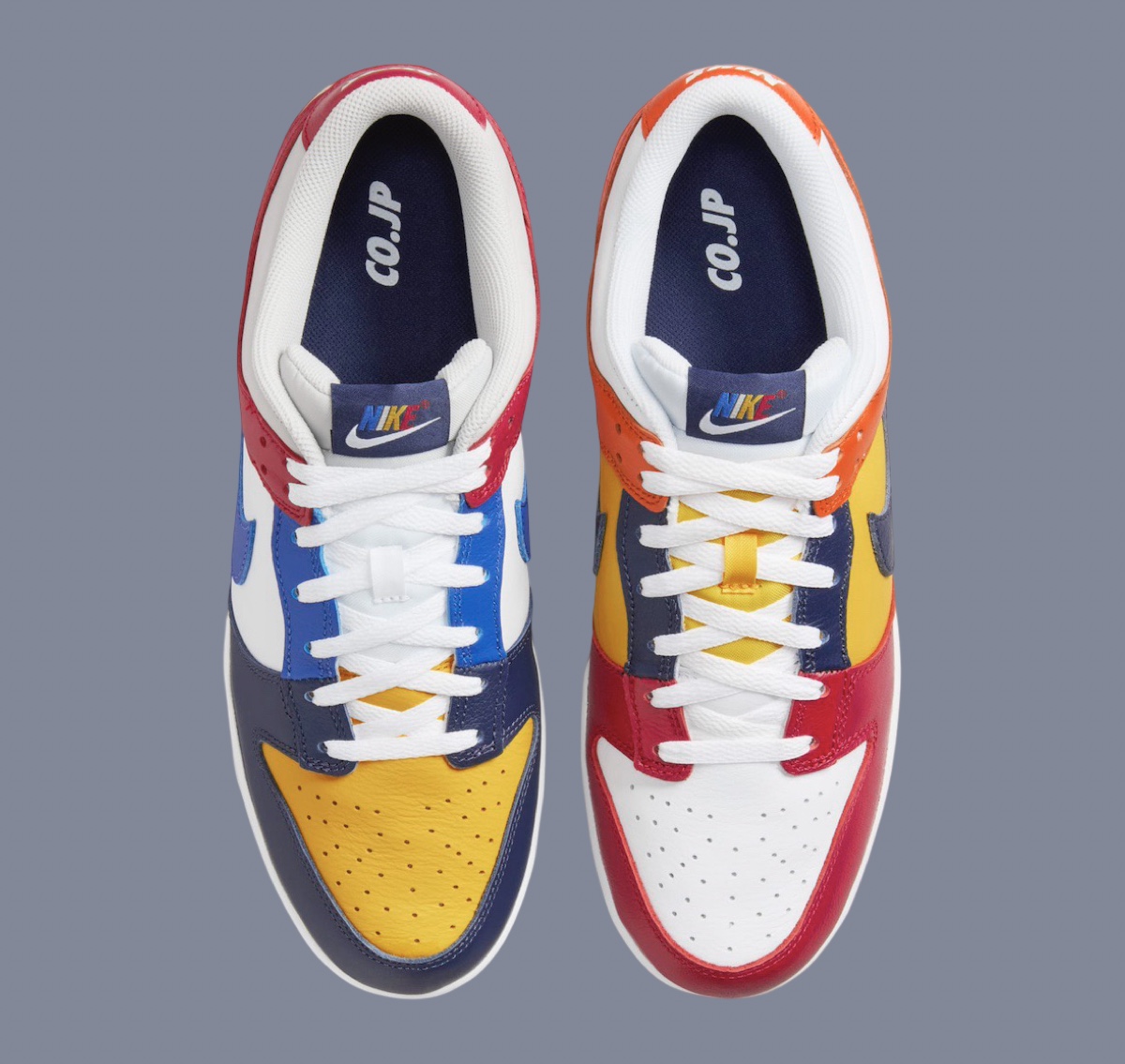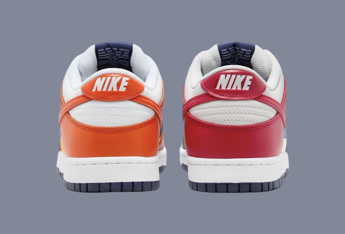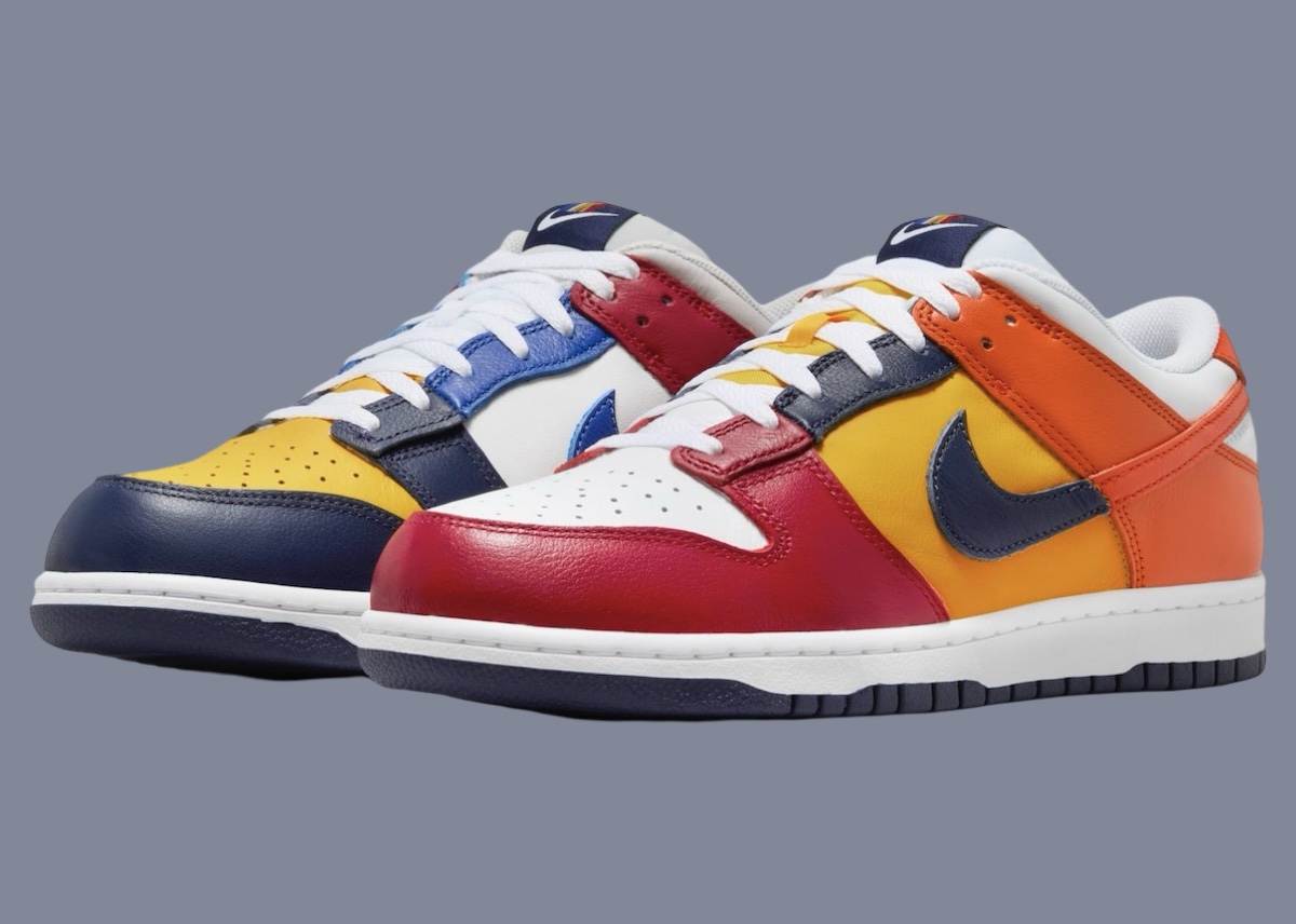 这双 Nike Dunk Low CO.JP “What The” 以鸳鸯拼接的方式,将 Dunk 鞋型元年的诸多配色融合在一起。