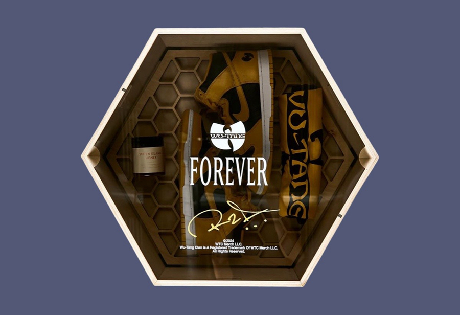以蜂巢为灵感的特殊鞋盒有黄色和黑色两款,呼应了鞋款配色以及说唱团体的标志性颜色。