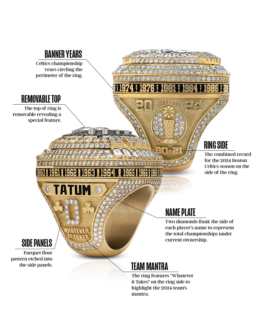 凯尔特人的冠军戒指也正式揭晓,细节可谓拉满,处处都彰显着绿军荣耀。