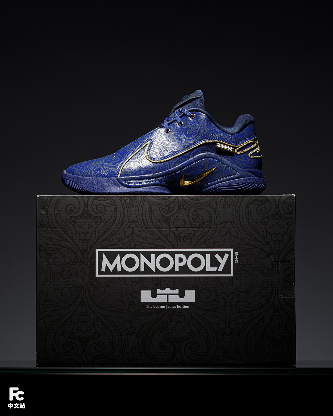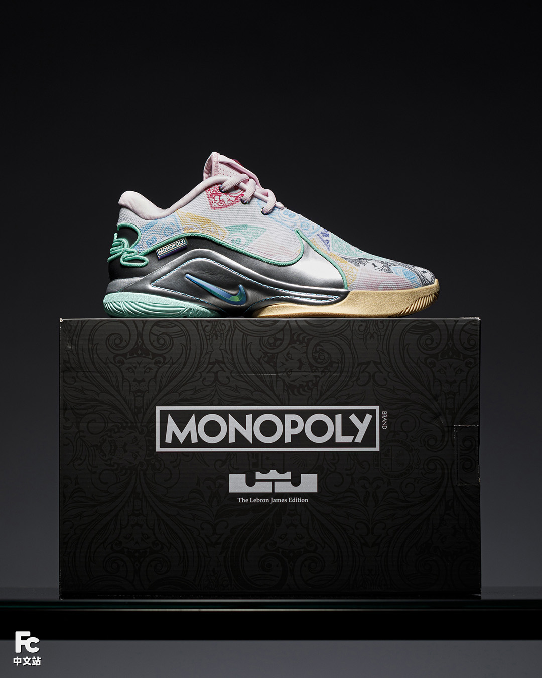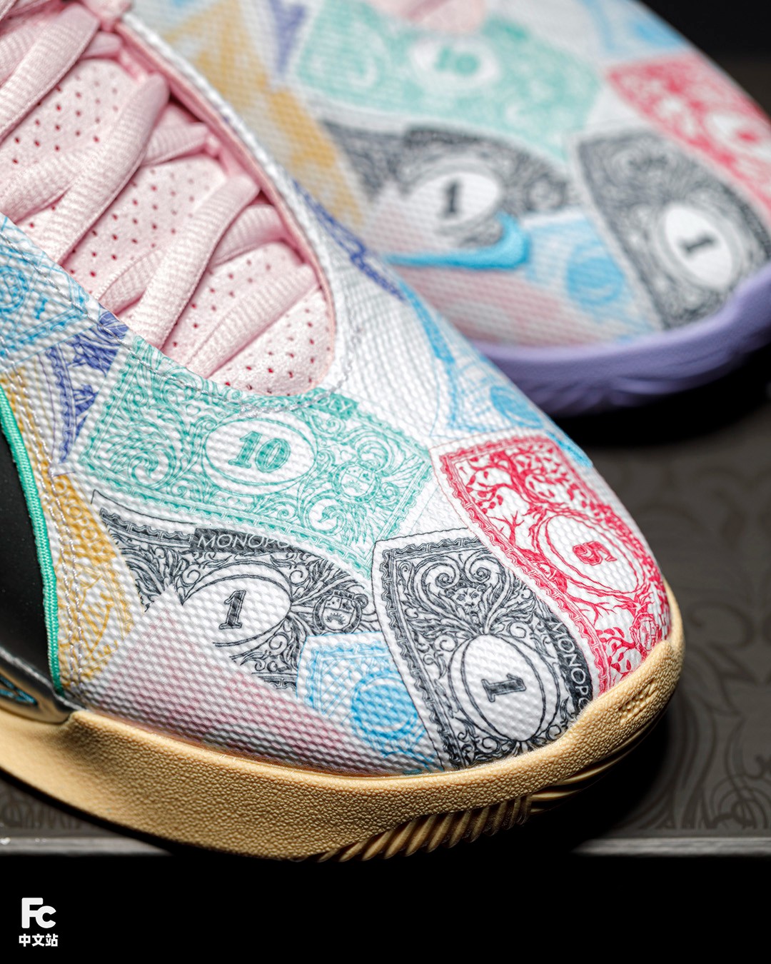 MONOPOLY 大富翁是詹姆斯儿时最爱的桌面游戏,某种程度上也启发了他的投资思维,为日后的商业帝国打下基础,而鞋面上这些五彩缤纷的钞票,就是游戏中的 “货币”。
