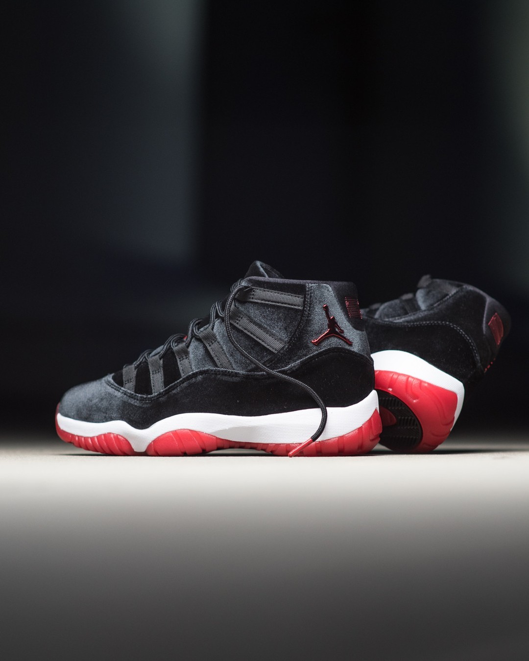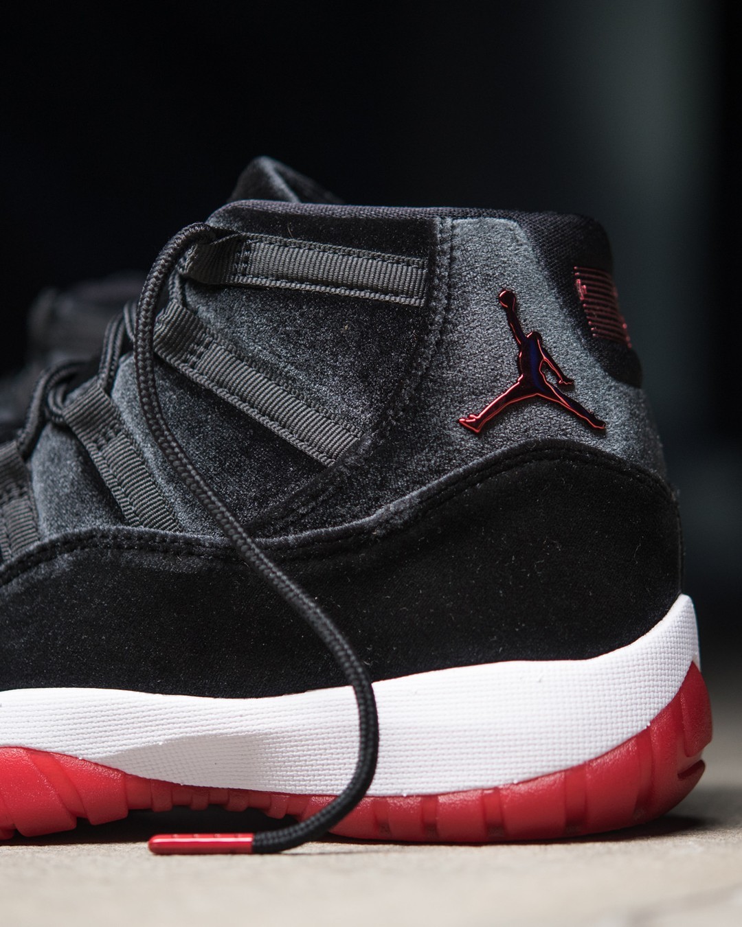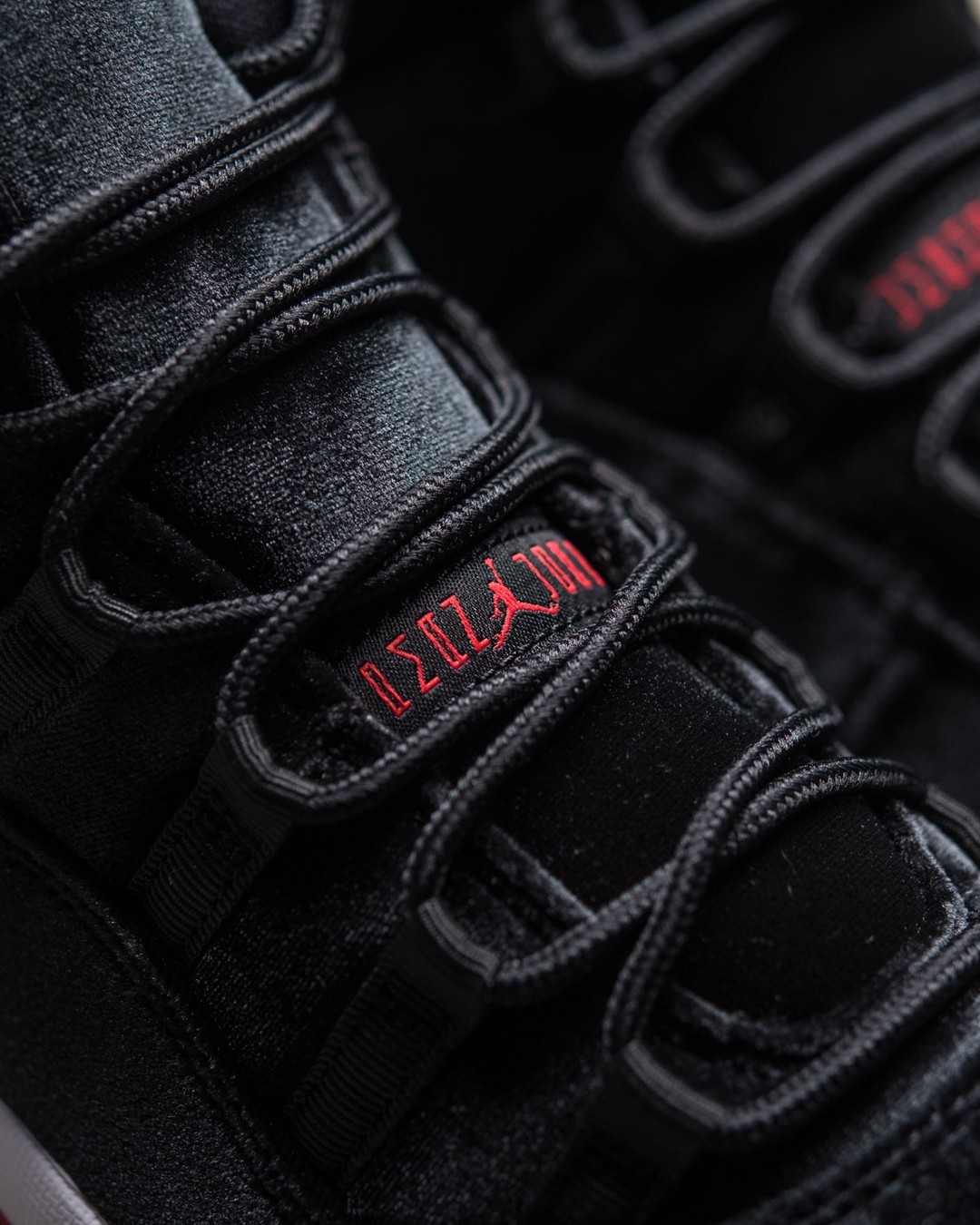 除此之外,今早还有黑红丝绒 Air Jordan 11 “Bred Velvet” 一并登场。