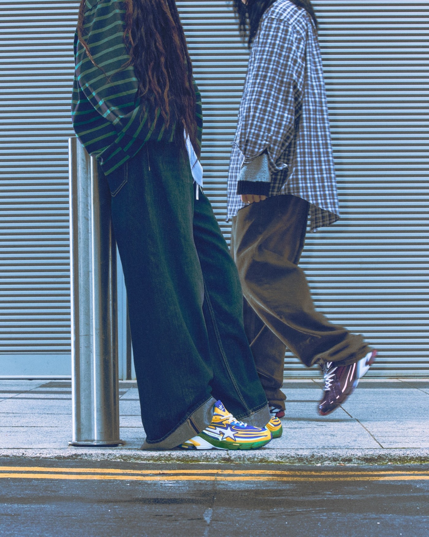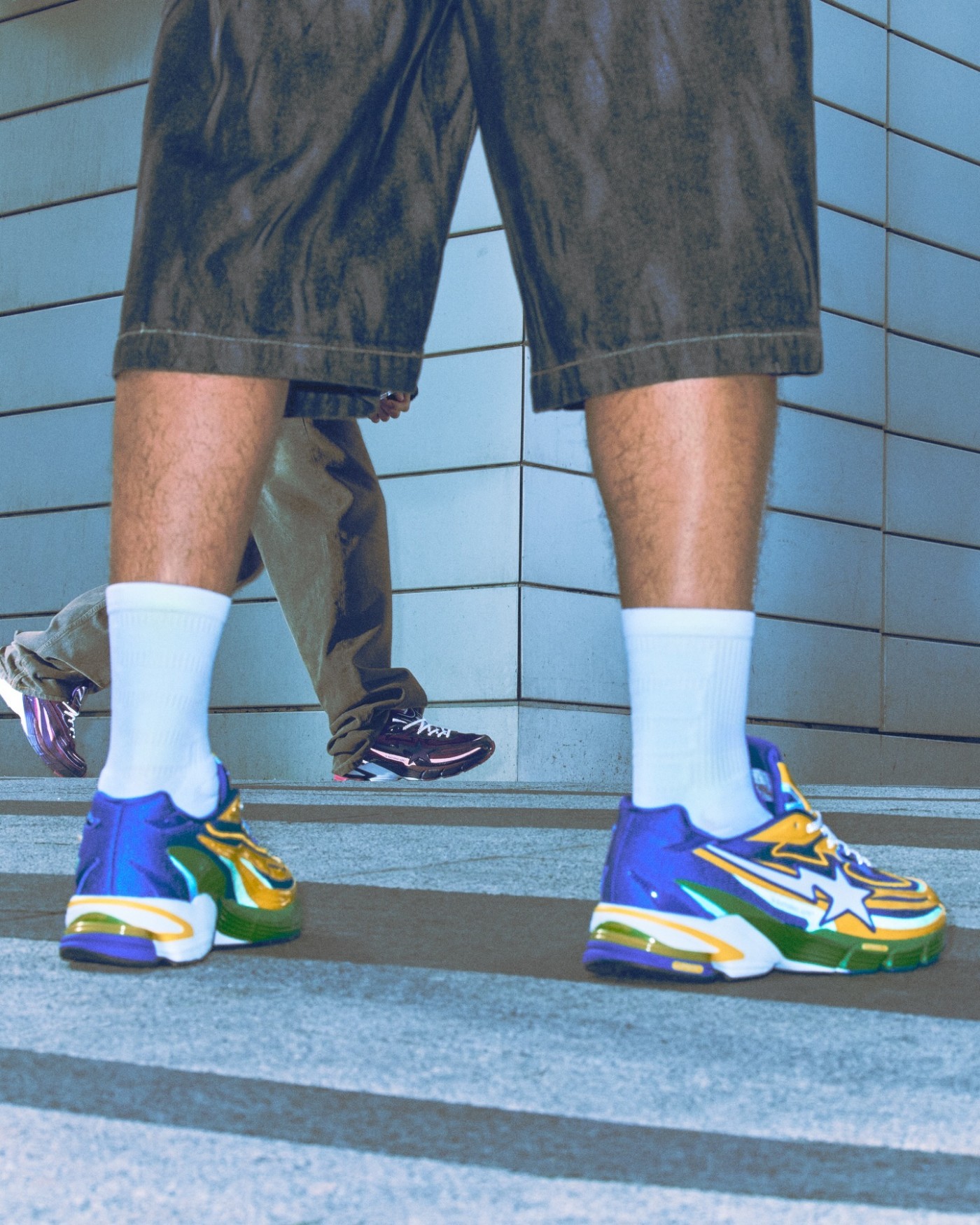特别值得一提的是,左、右脚外侧,分别将标志性的 BAPE STA 标志和 adidas 三线元素呈现,带来潮流与经典的视觉对撞。