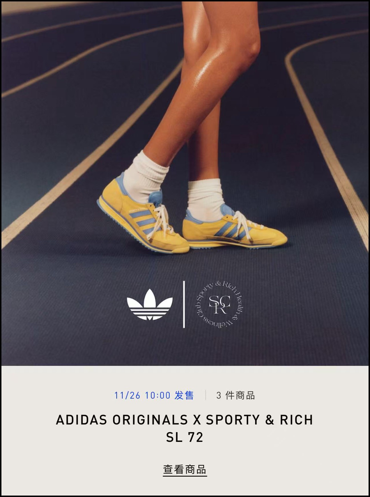 据悉,全新 adidas Originals x Sporty & Rich SL 72 合作系列将于 11 月 26 日登场,定价为¥1099 元,感兴趣的玩家不妨留意。