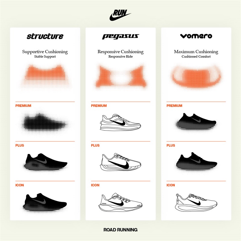 首先全新简化后的产品线由三个类别组成,熟悉的飞马 Pegasus 系列代表回弹缓震,Vomero 系列为顶级缓震,Structure 系列则代表支撑缓震。