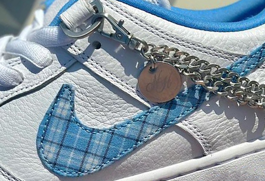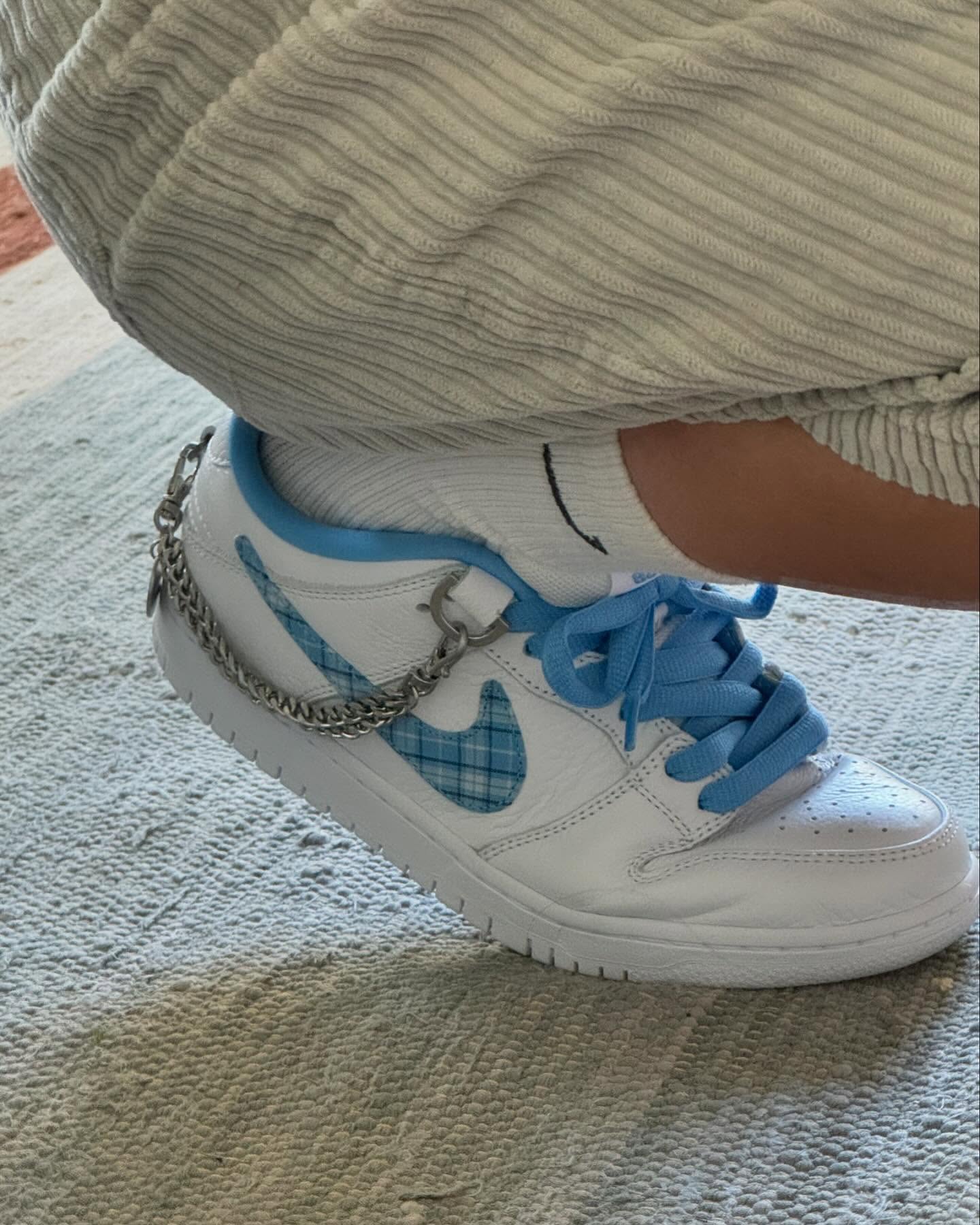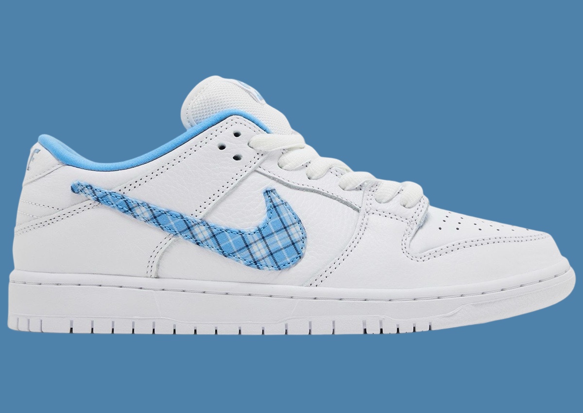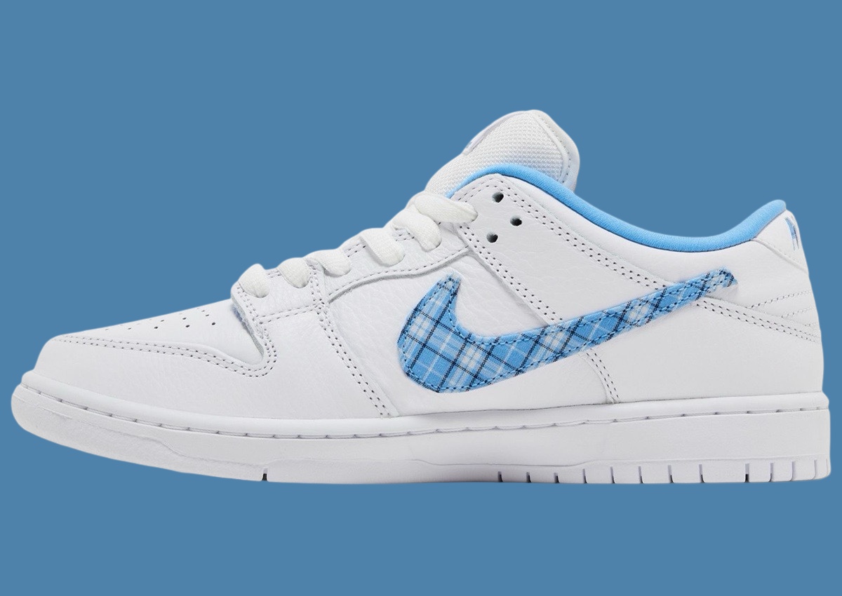 整双鞋在清爽的白色皮革衬托下,采用蓝白格纹点缀 Swoosh 及后跟部位。