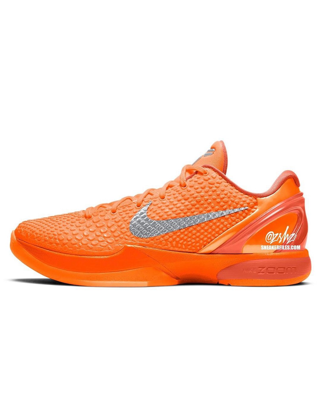 紧接着则是一双橙色六代,这个设计灵感就很明显了,来自 WNBA 橙色 Logo,科比生前也多次上身那件橙色帽衫。
