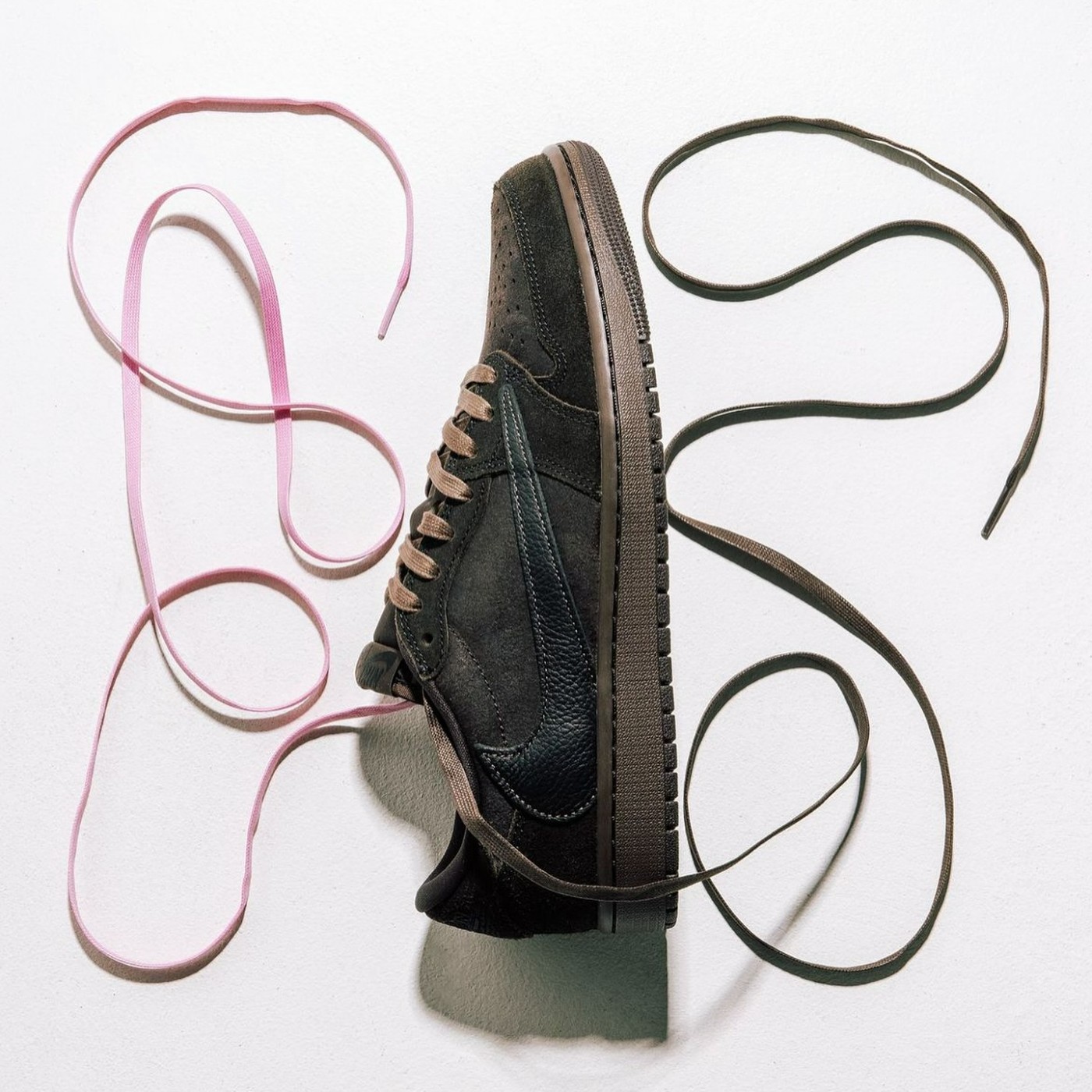 随鞋附赠了粉、棕两款鞋款,换上粉色款会更像「初代倒钩」Air Jordan 1 Low。