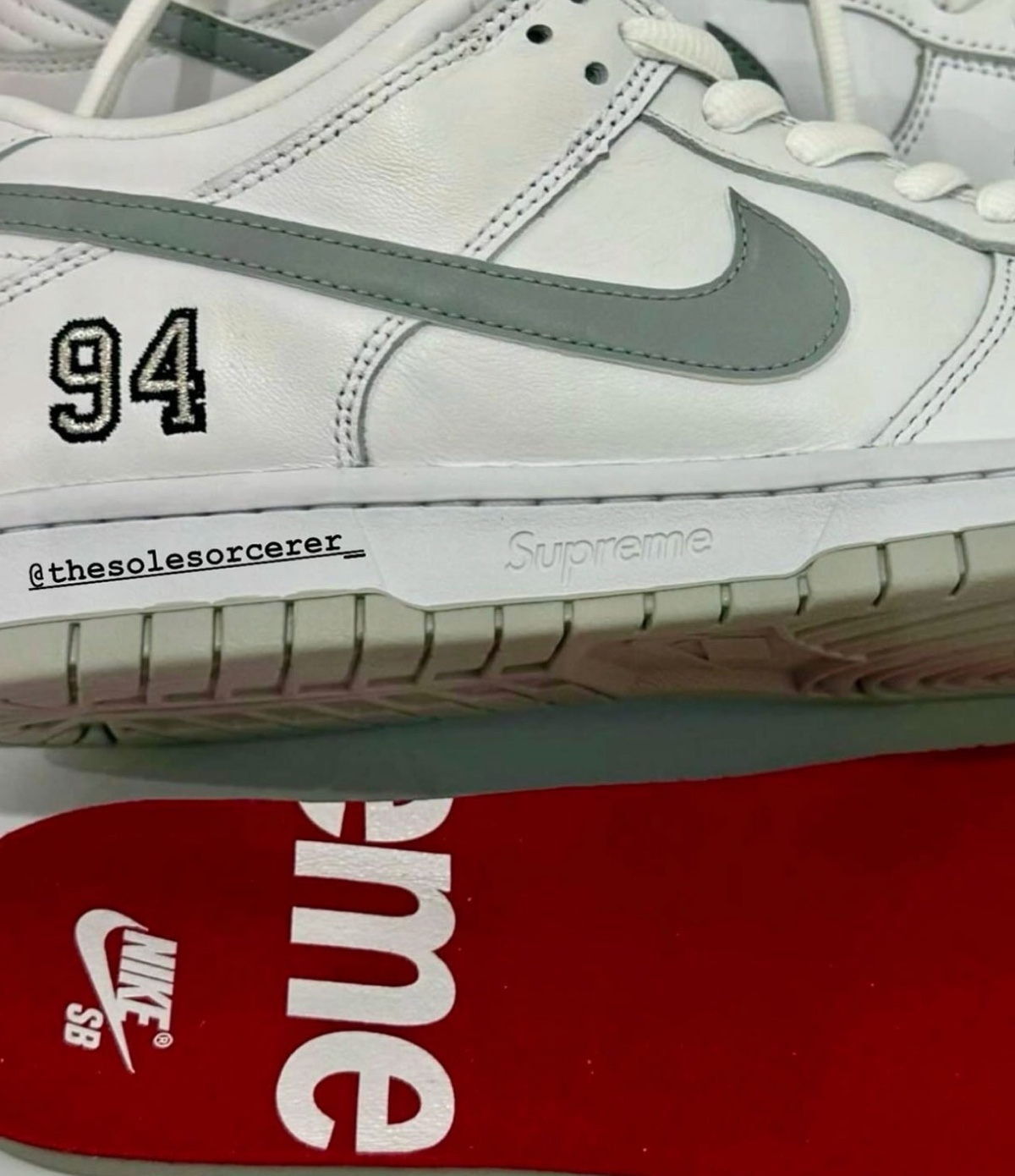 整双鞋的设计元素基本一眼就看全了,鞋跟 94 字样代表 Supreme 的创立年份。中底位置则是刻上了彰显联名身份的 Logo。