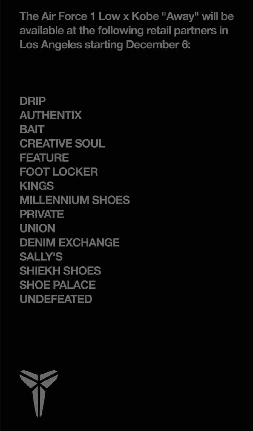 除了湖人配色 Kobe x Nike Air Force 1 Low 昨日在国区率先登场外,此前曝光限量 8000 双的客场黑色版本,今日仅限于洛杉矶的指定店铺突袭发售,似乎我们身处国区是无缘了。
