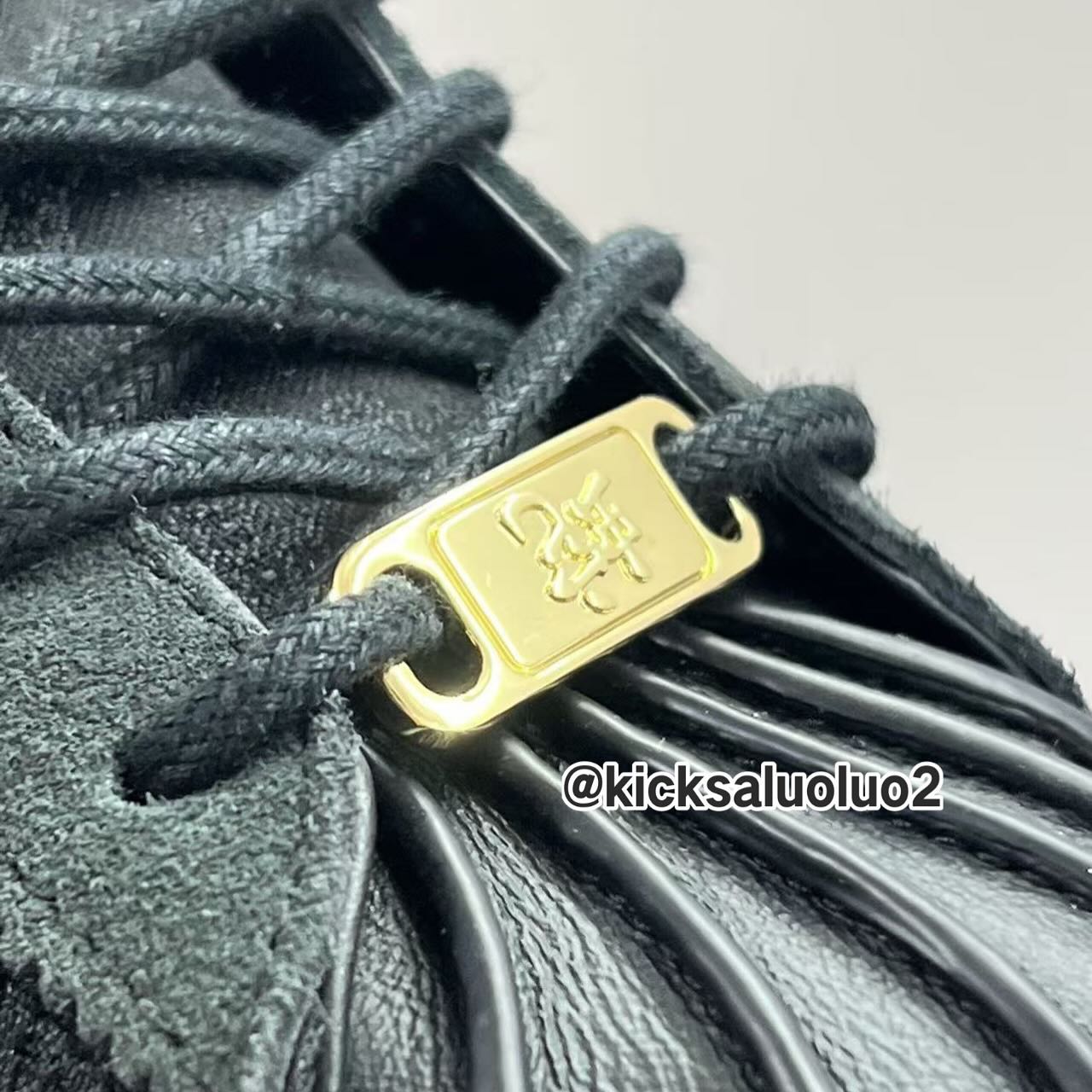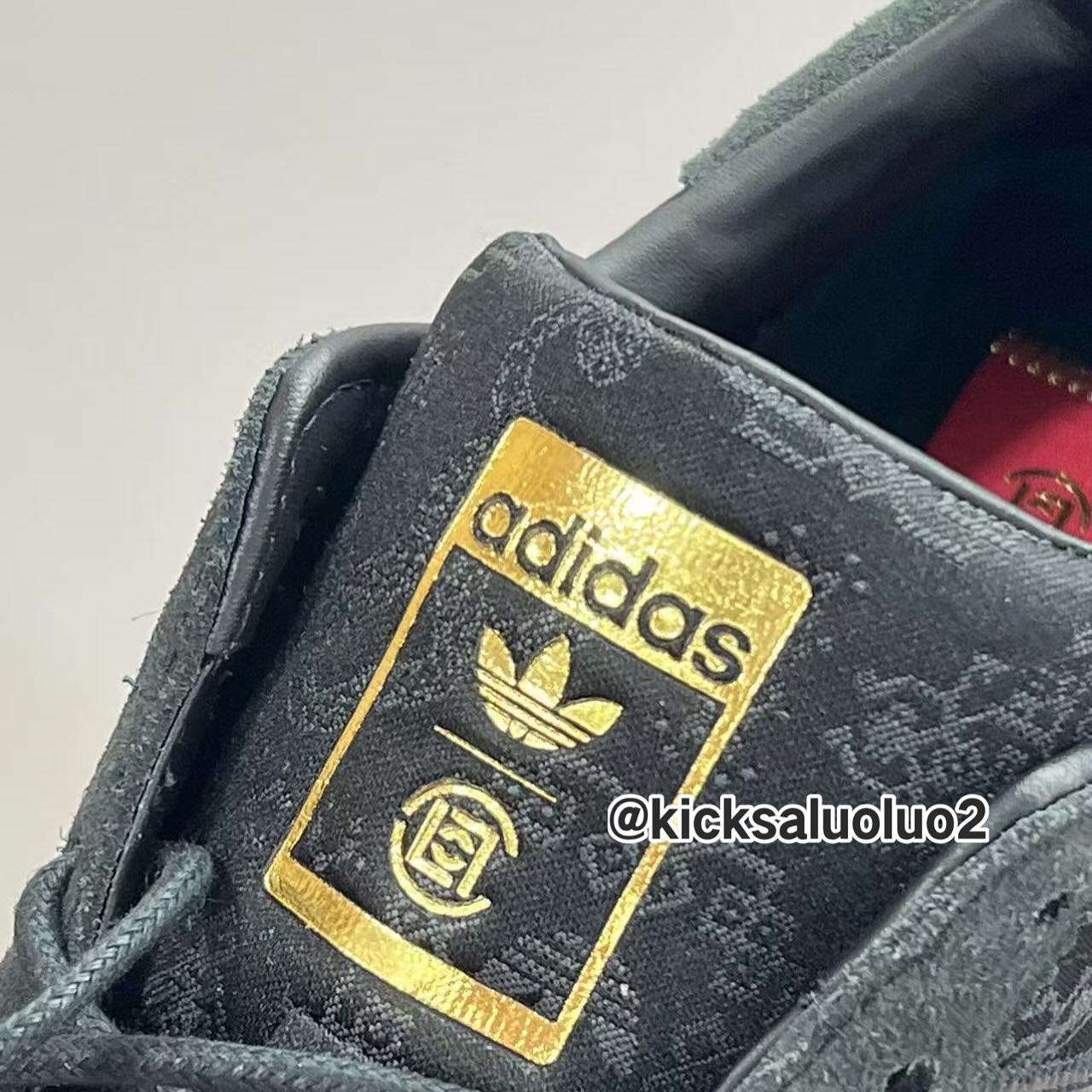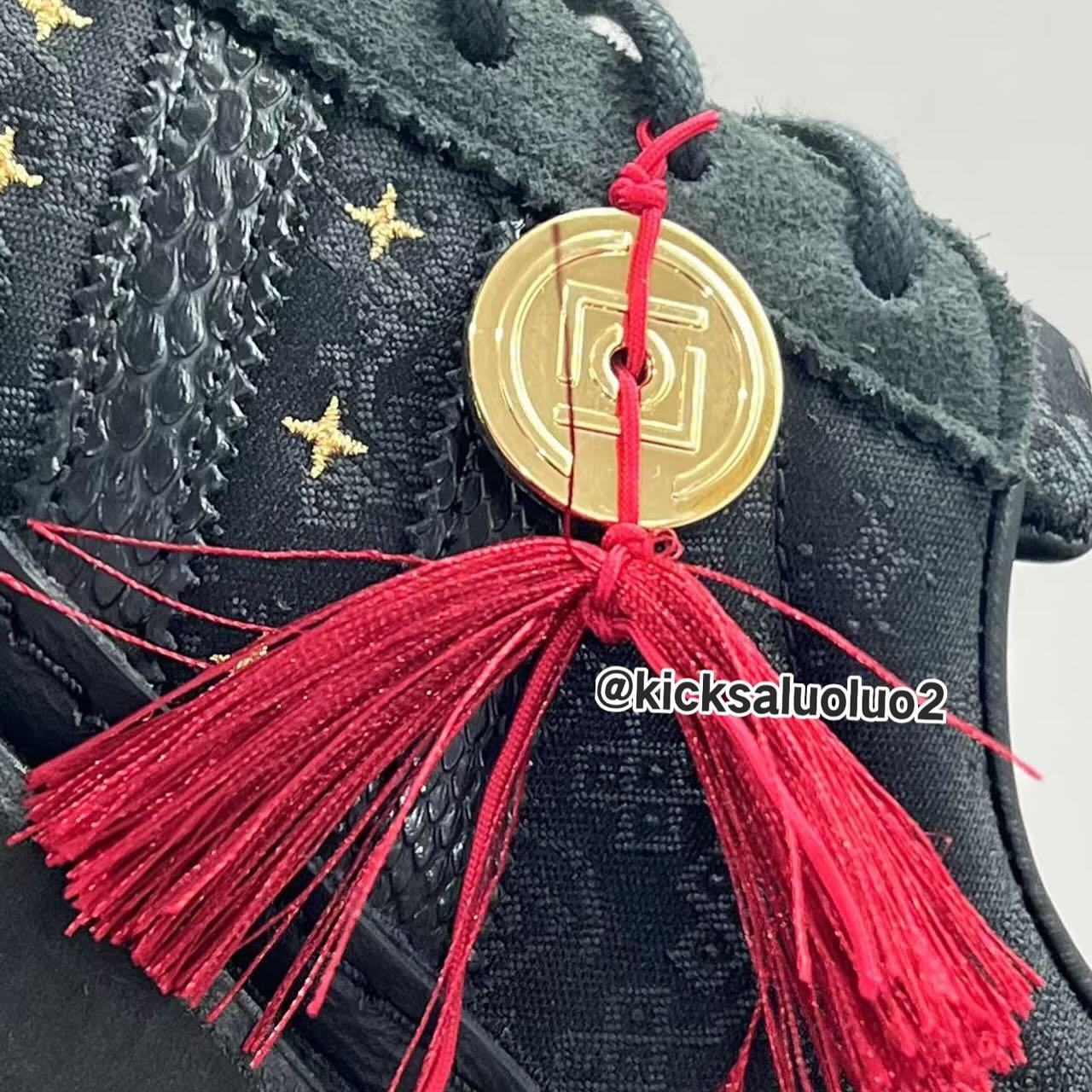 整双鞋以黑色贯穿,辅以金色的细节点缀,鞋面纹理则是熟悉的中国国风,同时呈现了三叶草 LOGO 和 CLOT 标志,鞋带扣上的「蛇」字表明了它的配色主题。
