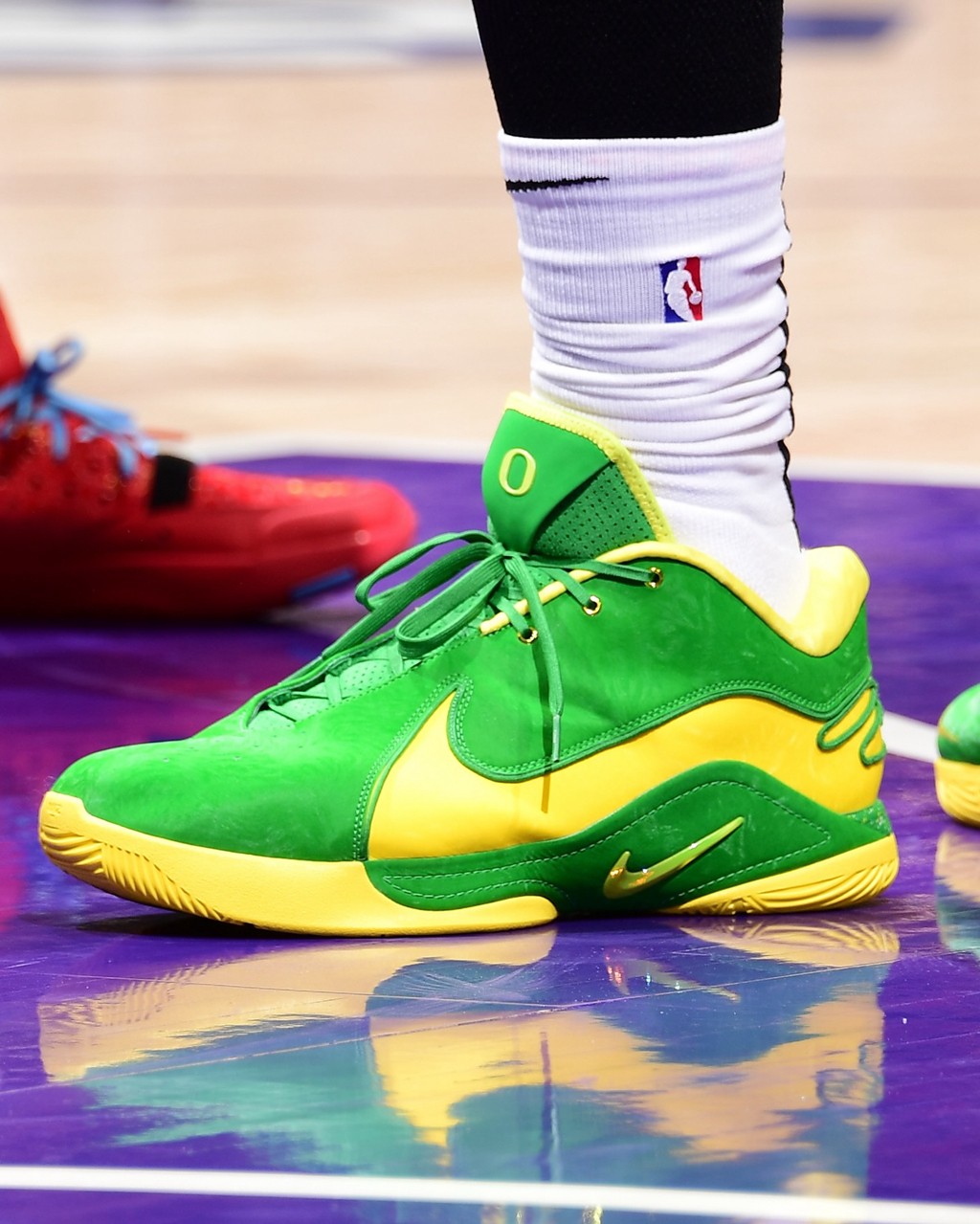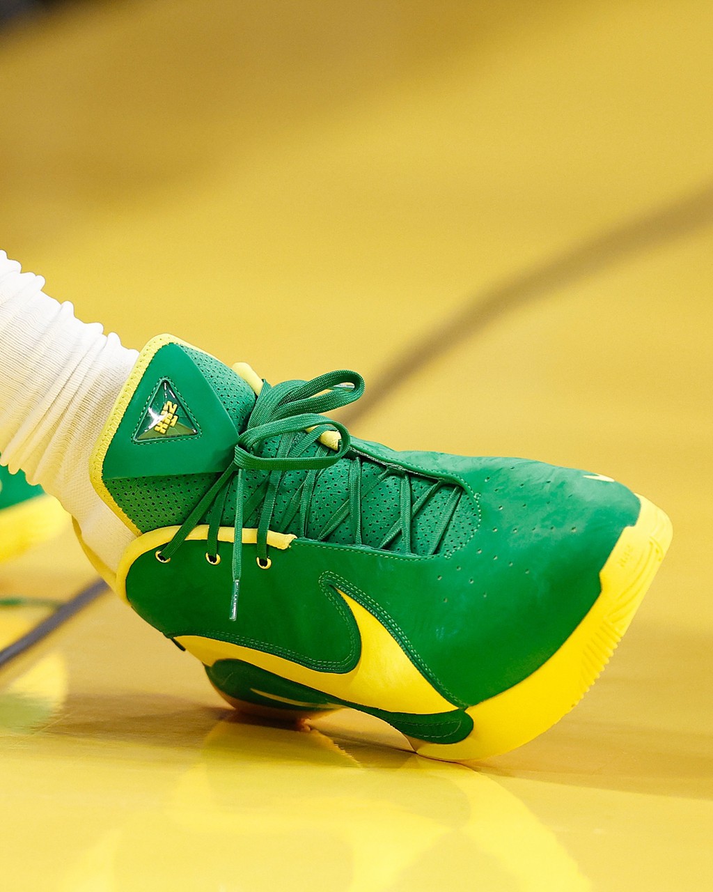 詹姆斯这双就是 Nike 专门为本赛季 NCAA 俄勒冈鸭队打造的 PE,鞋舌 O 字 Logo 彰显了其正宗血统。