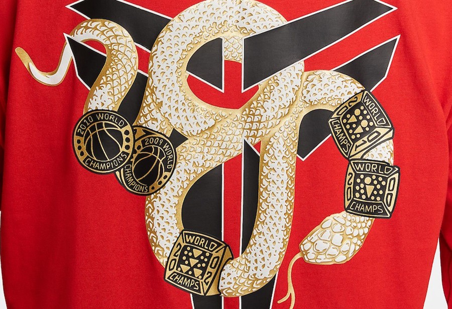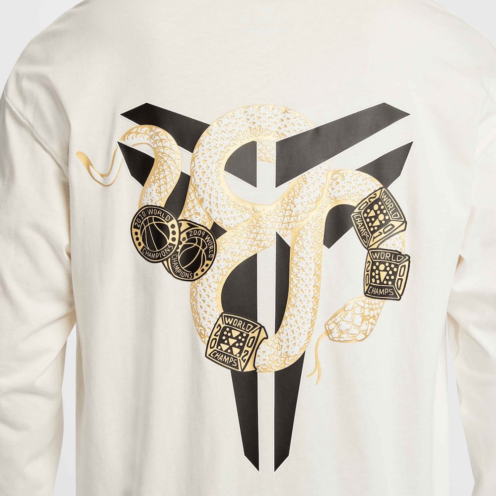 其中最引人瞩目的恐怕就是长袖 T恤背后的金蛇冠军戒指图腾与硕大的 Kobe Logo 交融,释放出鲜明的曼巴蛇年特色。