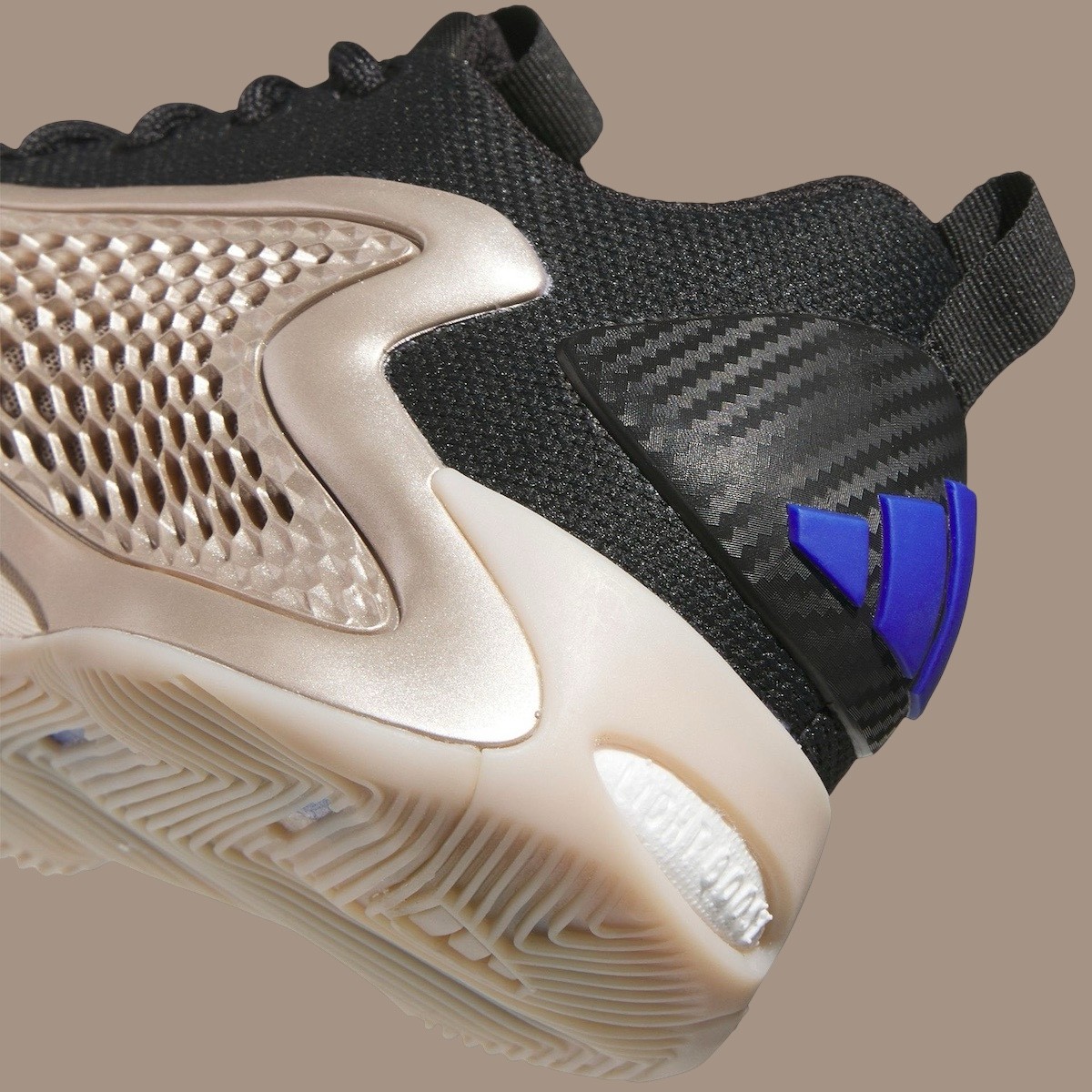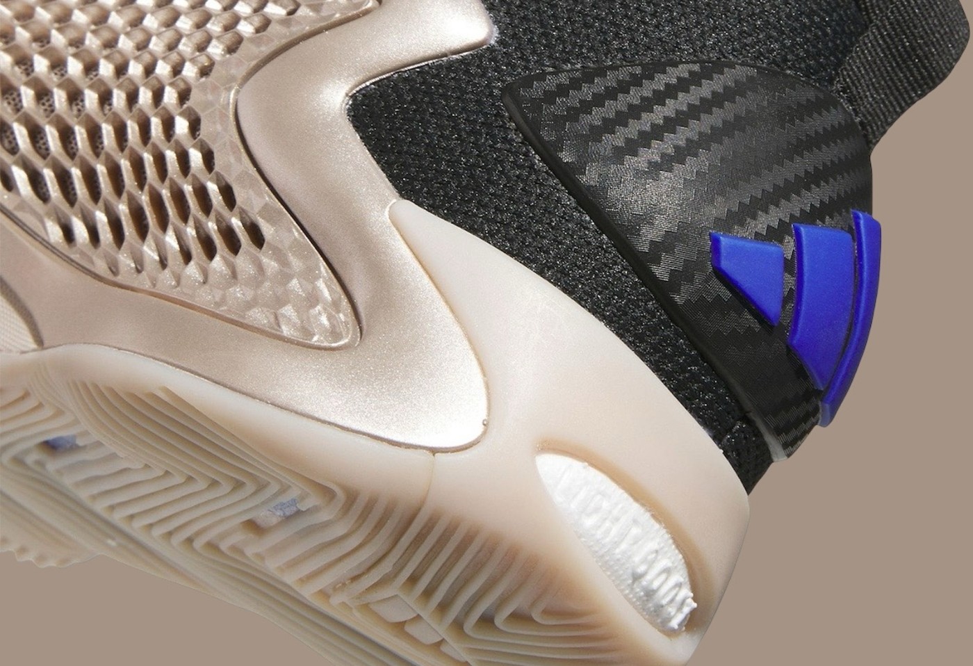 后跟以碳纤维纹理托衬蓝色三条杠,形成反差效果,为整体鞋款注入了亮点。