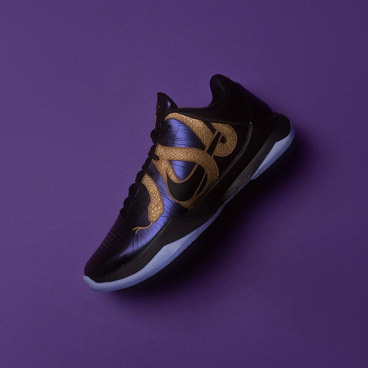 一席酷黑的光泽笼罩下,隐约能看到盘踞在鞋侧的曼巴蛇元素,虽然缺少了蛇年主题的节日氛围,但却更符合科比的曼巴气质,冷峻犀利。