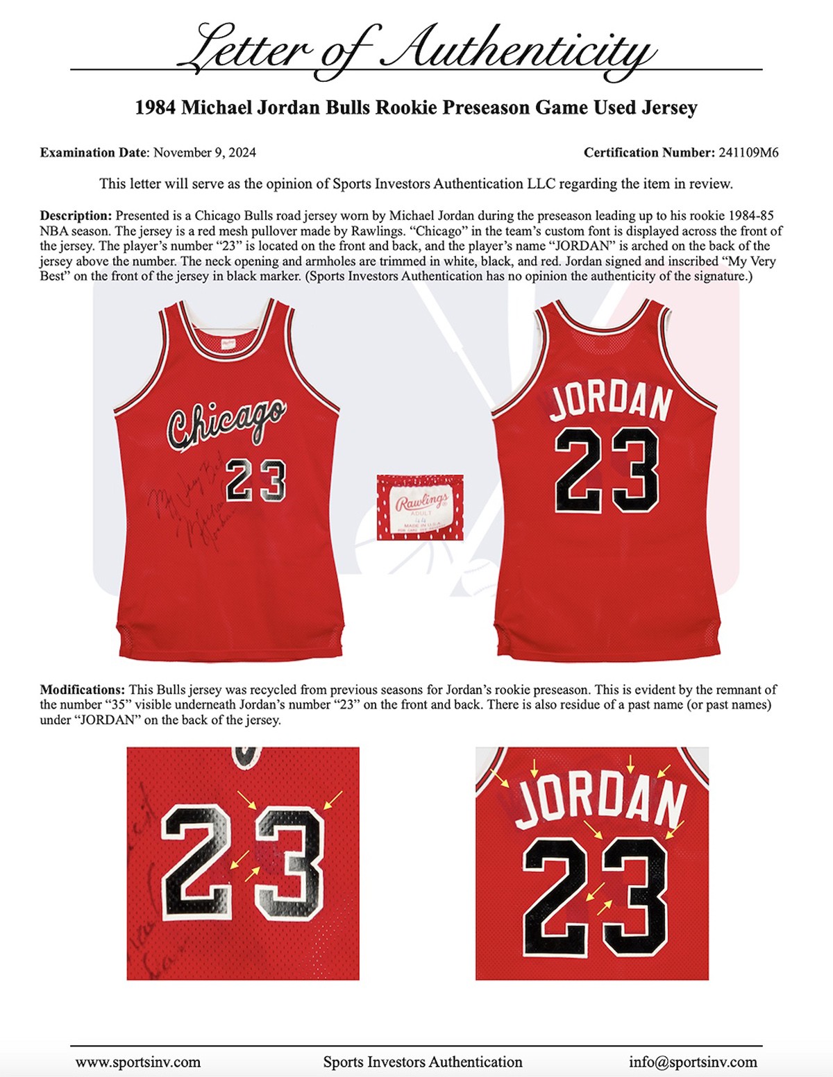 其中乔丹这件为 1984 年 10 月 5 日公牛队的季前赛首秀,并在球衣上有乔丹本人的亲笔签名。