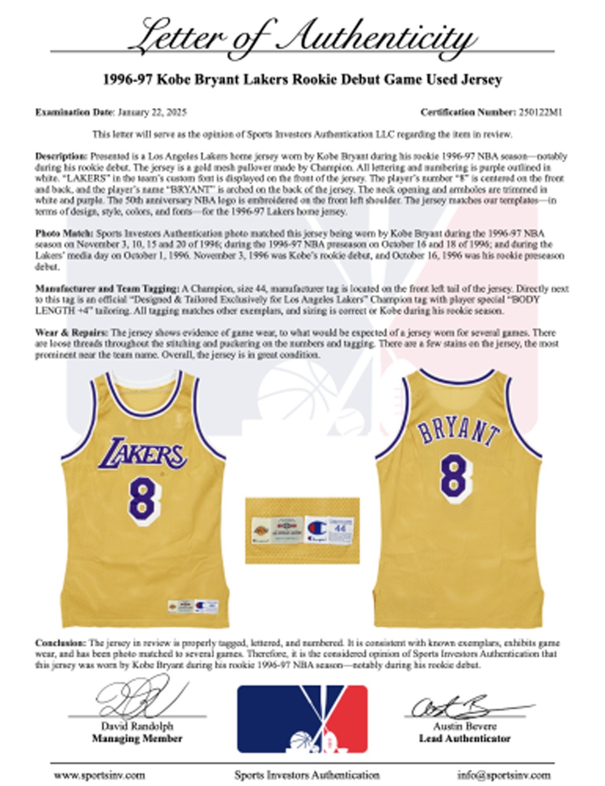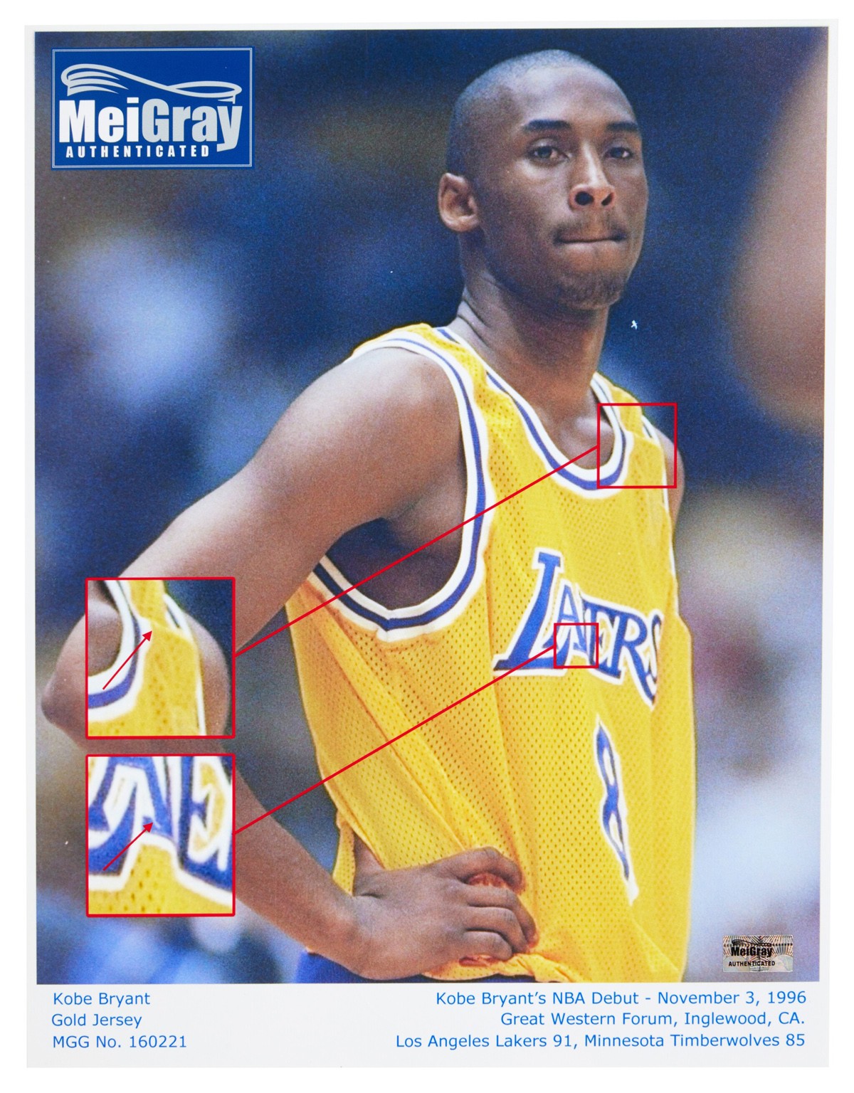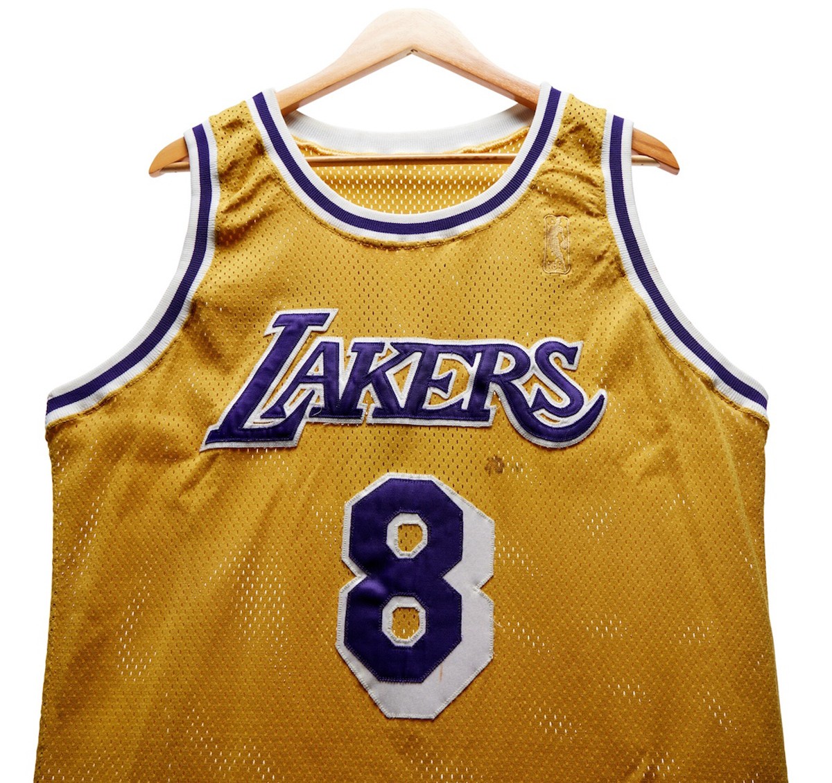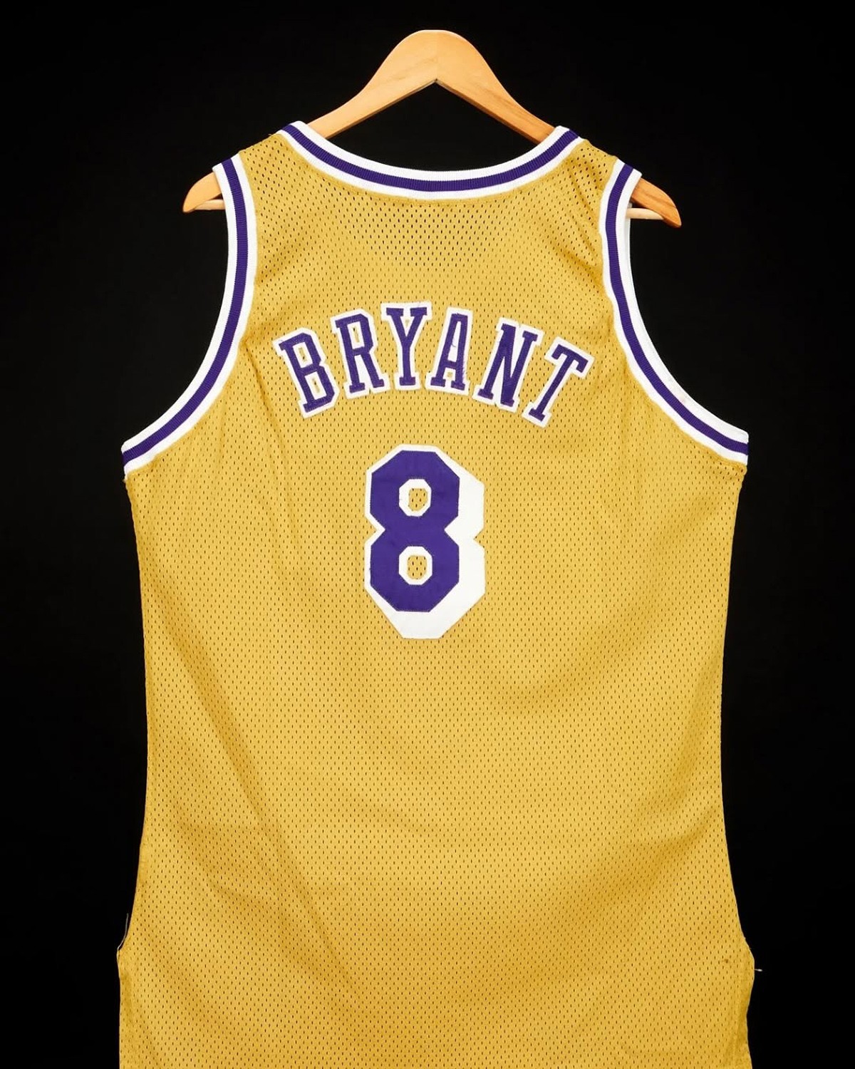 科比则是 1996 年 11 月 3 日以最年轻球员身份进入 NBA 的常规赛首秀球衣,号码为最初的 8 号。这件球衣也是当年科比参加第一个 NBA 媒体日、季前赛首秀以及后续多场比赛中穿过。