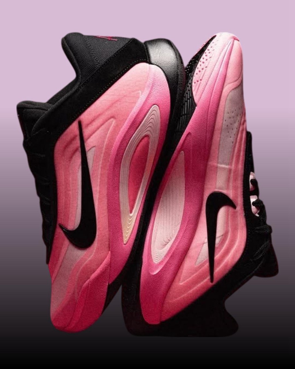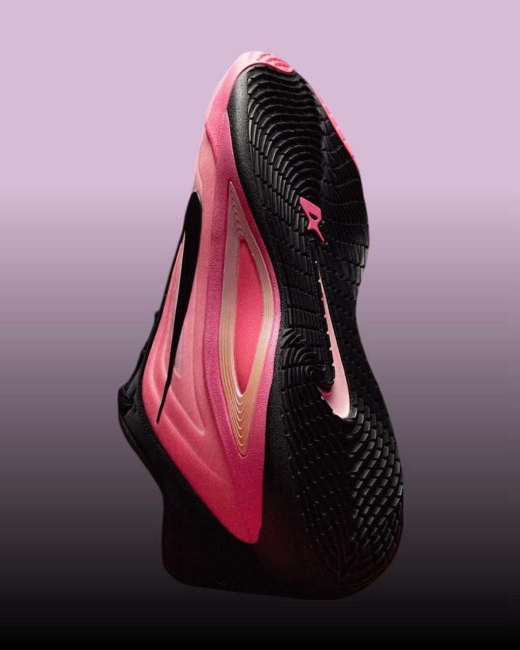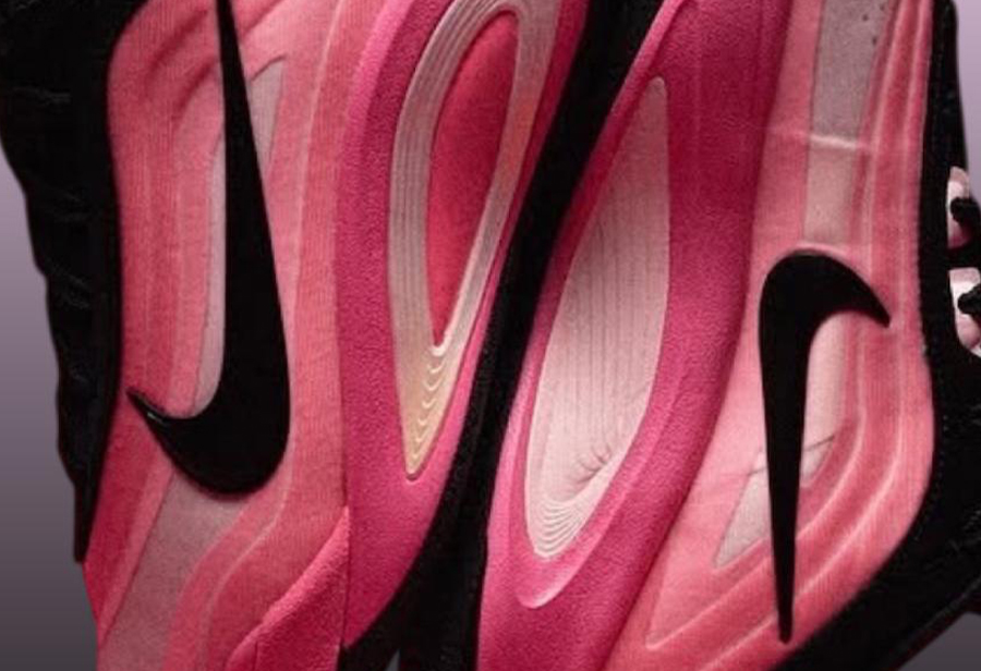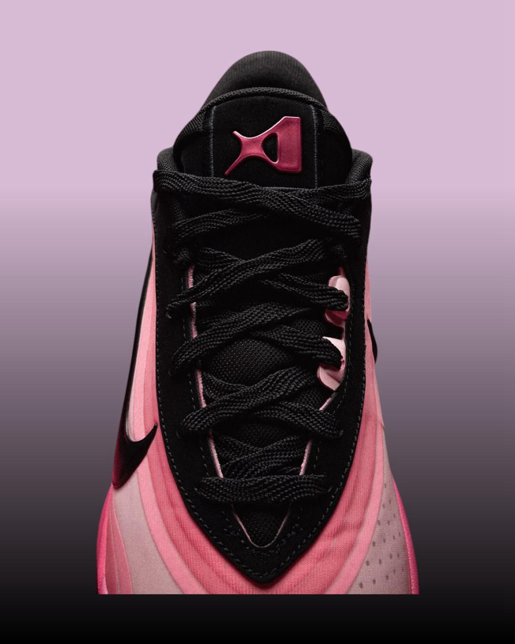 鞋身最具标志性的层叠渐变粉色得以延续,转而将鞋帮鞋舌登出覆盖深邃黑色。