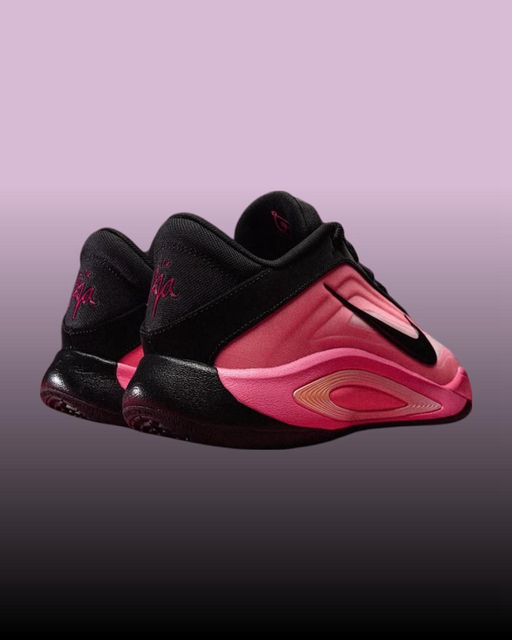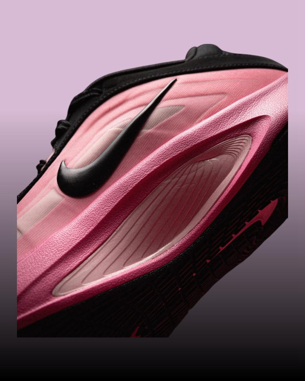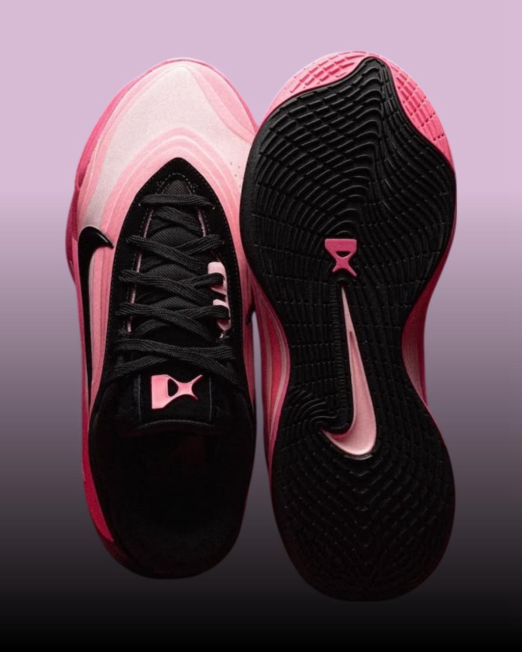 鞋身最具标志性的层叠渐变粉色得以延续,转而将鞋帮鞋舌登出覆盖深邃黑色。