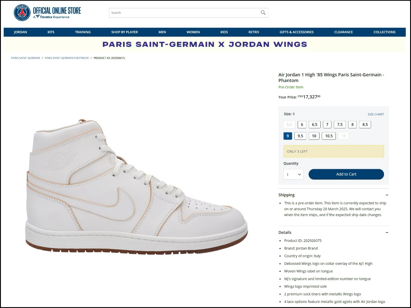版本二:限量 250 双,售价 €2200 欧元,将近一万七人民币,目前已经通过 PSG 官网上架。